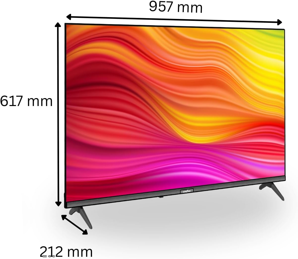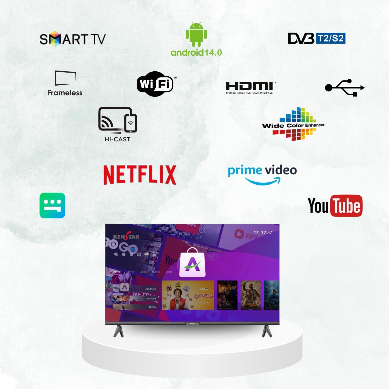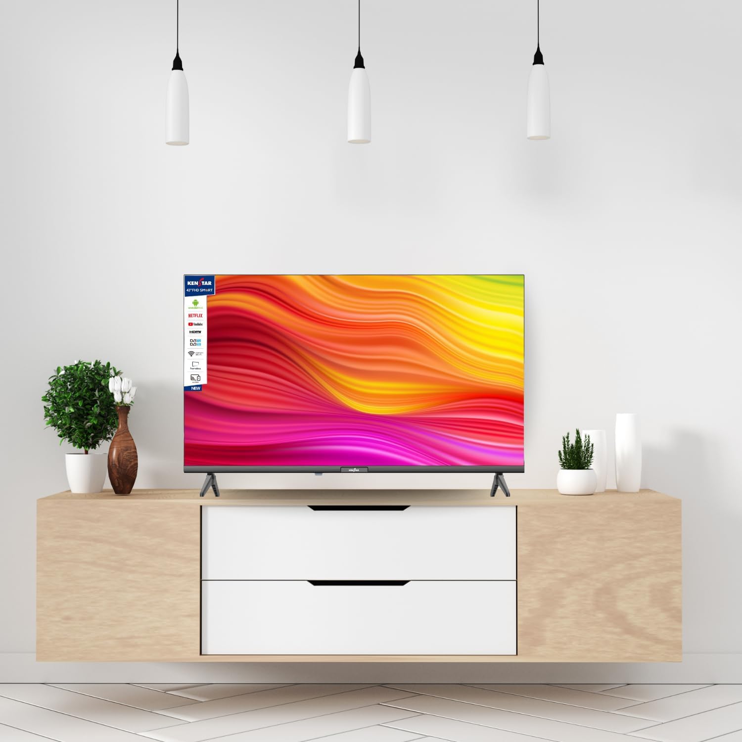 كينستار تلفزيون ذكي FHD 43 بوصة مع جهاز استقبال DVB-T2/S2، تصميم نحيف بدون اطار، اندرويد 14 فولت، مع تطبيقات نتفليكس ويوتيوب وبرايم فيديو وشاهد. يدعم HDMI وUSB وواي فاي هاي كاست. DR 1920×1080p