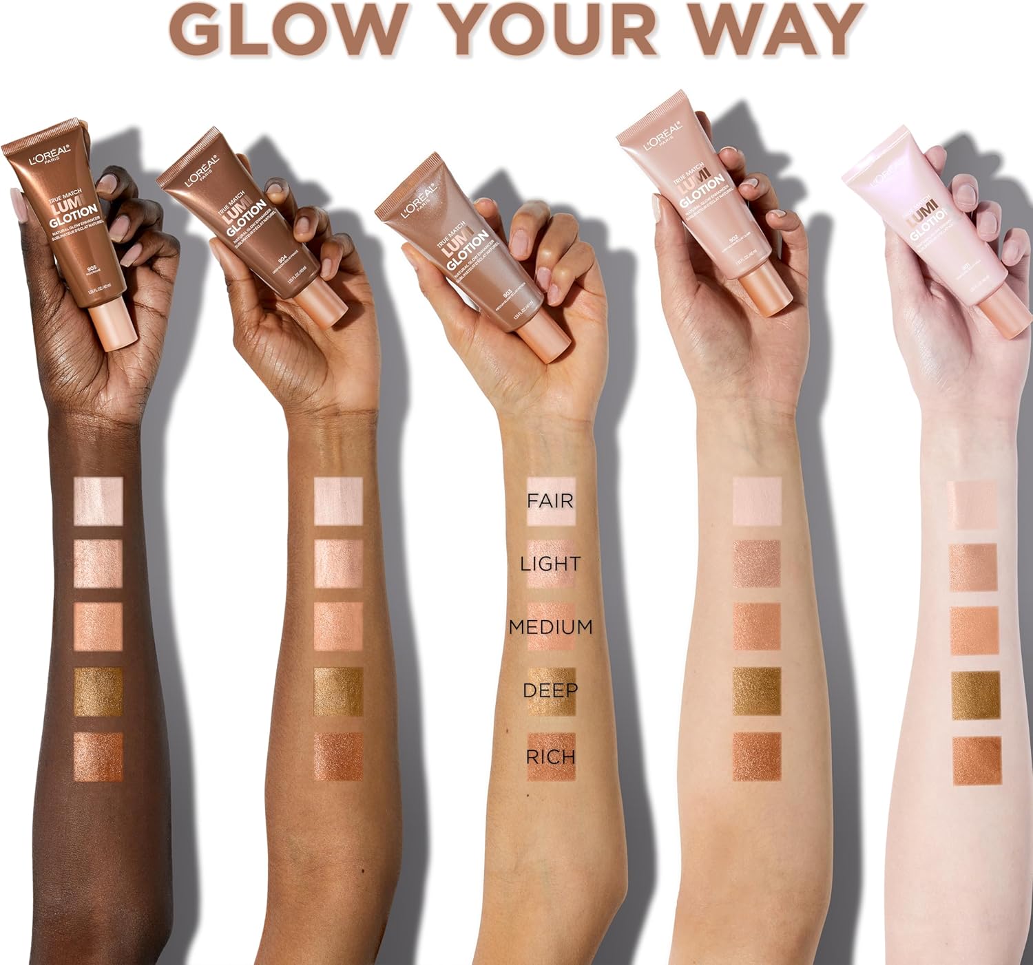 غسول فيرال تيك توك فيفوريت لوريال باريس ترو ماتش لومي جلوشن هو مرطب ملون مضيء غني بالجلسرين وزبدة الشيا لترطيب فوري ولمسة نهائية مشرقة. تركيبة هايلايتر خفيفة الوزن وتوفر لونًا مضيئًا لبشرة صحية ومتوهجة. يُستخدم على الوجه والجسم. متوفر في 5 درجات لون.