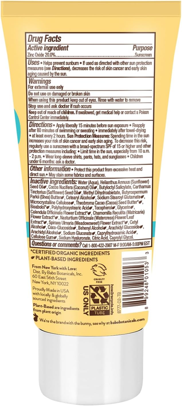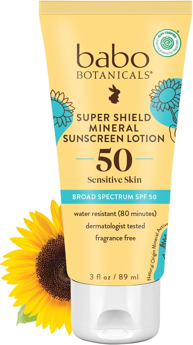 Sheer mineral sunscreen Lotion, SPF 50. Extra sensitive sunscreen with 100% zinc oxide mineral active ingredient. Babo’s gently formulated, fragrance free sunscreen is perfect for extra sensitive skin and protecting your family against damaging while providing 80 minutes of water and sweat resistance. This lightweight, non-greasy and hypoallergenic formula is enriched with Calendula and shea butter and organic cocoa butter to soothe and moisturize the skin. Reef safe. Gluten, soy and dairy free. The formula was created by a mom of three.