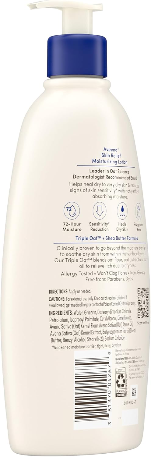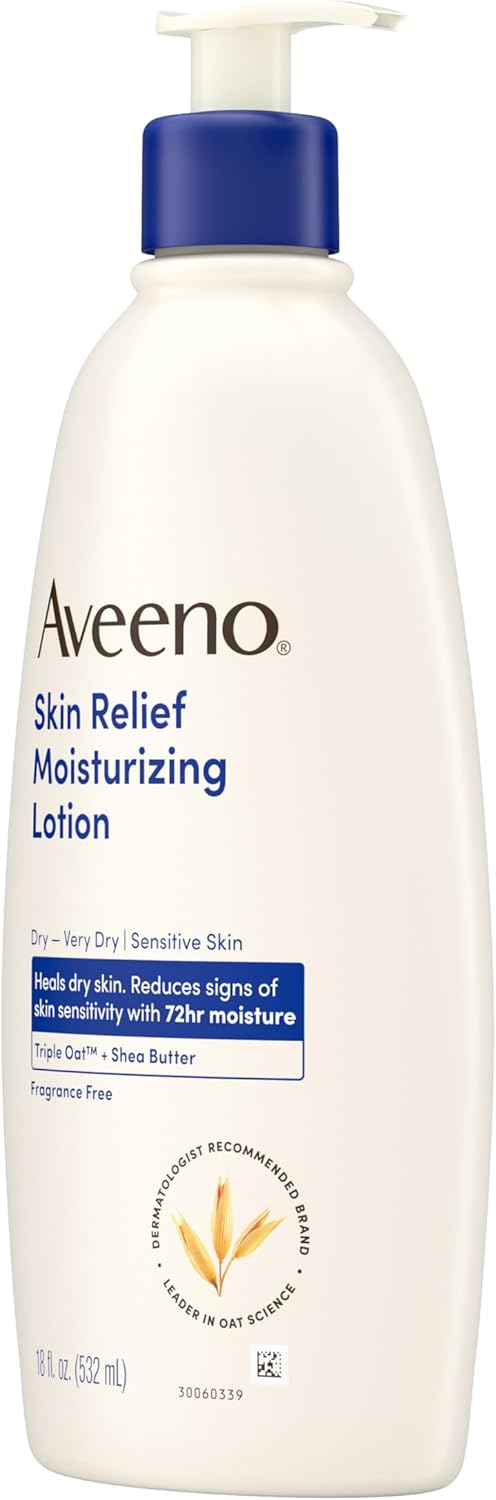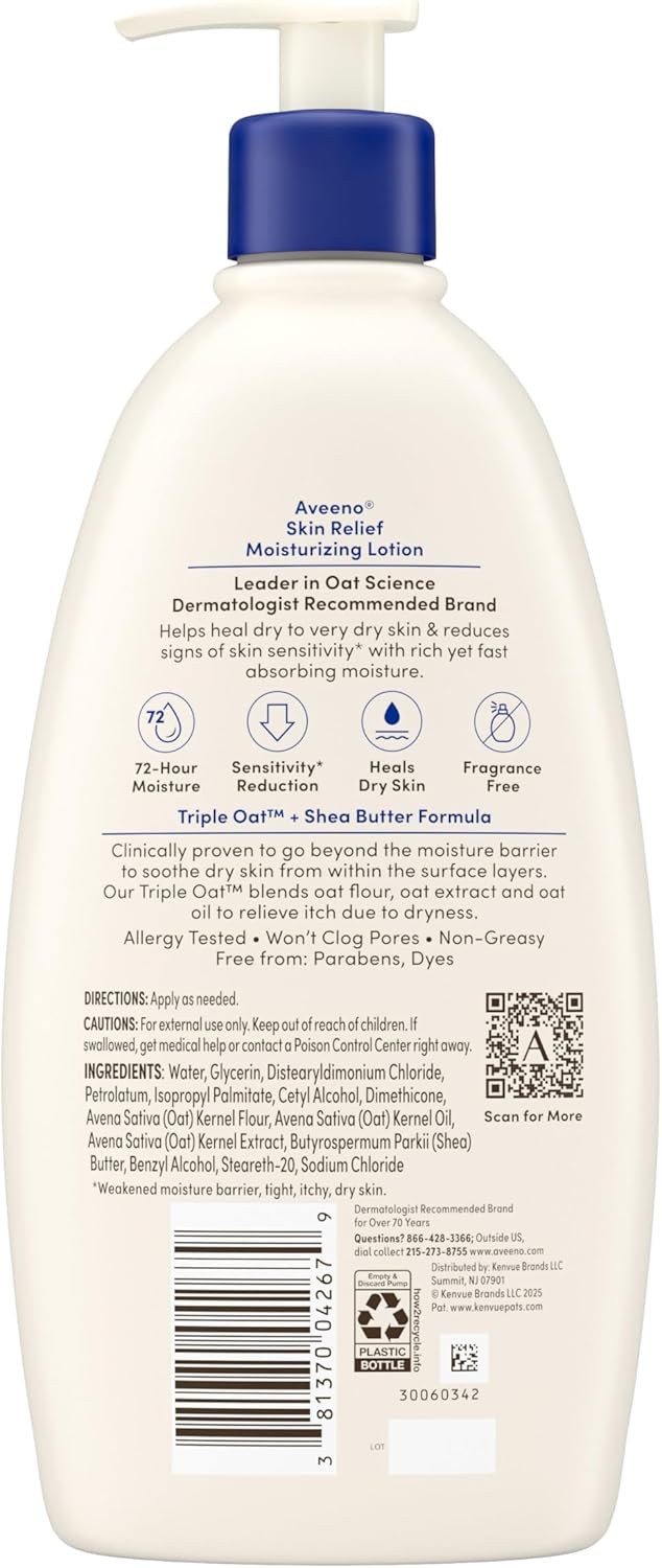 18 أونصة سائلة من لوشن الجسم المرطب الخالي من العطور افينو Skin Relief مع تركيبة ثلاثية مهدئة من الشوفان وزبدة الشيا تساعد على شفاء البشرة الجافة جدًا وتوفر راحة مثبتة سريريًا للبشرة الجافة والحكة مع رطوبة لمدة 48 ساعة