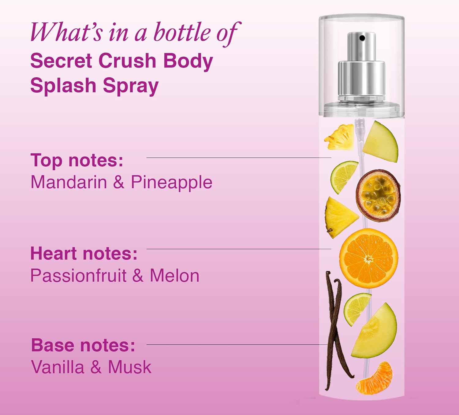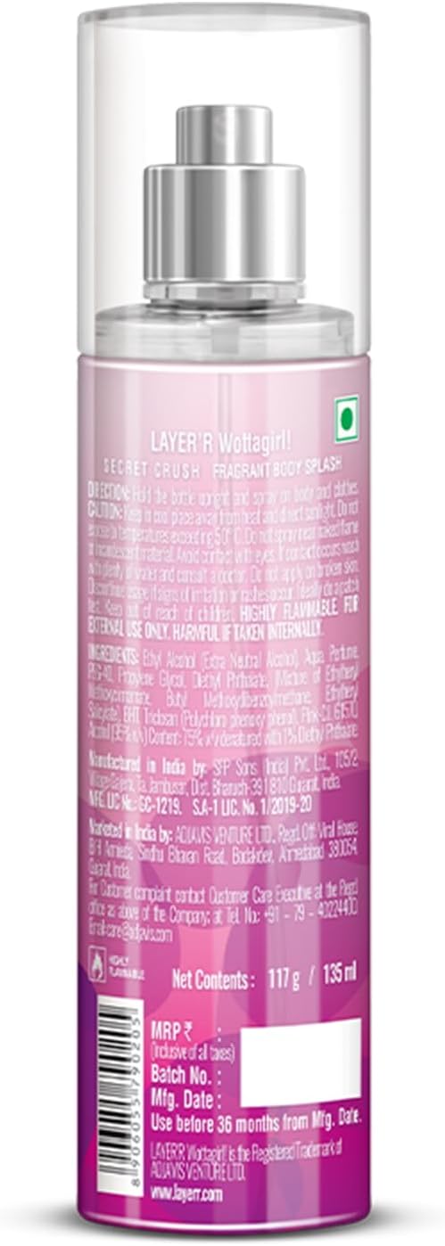 الكمية: 135 مل | شكل المنتج: بخاخ | عطور عالمية فريدة | حوالي 1500 بخاخ لكل زجاجة | الجمهور المستهدف: النساء | الاستخدام: امسك الزجاجة في وضع مستقيم. رش على بعد 15 سم من الجلد. تجنب ملامسة العين | محتويات العبوة: 1 بخاخ للجسم | بلد المنشأ: Indiaليرير Wottagirl Secret Crush Body Splash للنساء، 135 مل