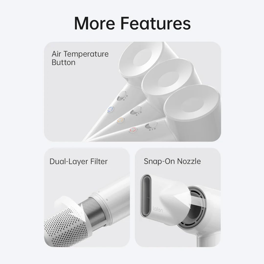 [سريع الجفاف] مجفف الشعر من لايفين مجهز بمحرك بدون فرش عالي السرعة 100,000 دورة في الدقيقة مع سرعة رياح تصل إلى 19 متر/ثانية. يمكن لتدفق الهواء القوي تجفيف الشعر في وقت قصير – أسرع 3 مرات من مجففات الشعر التقليدية.