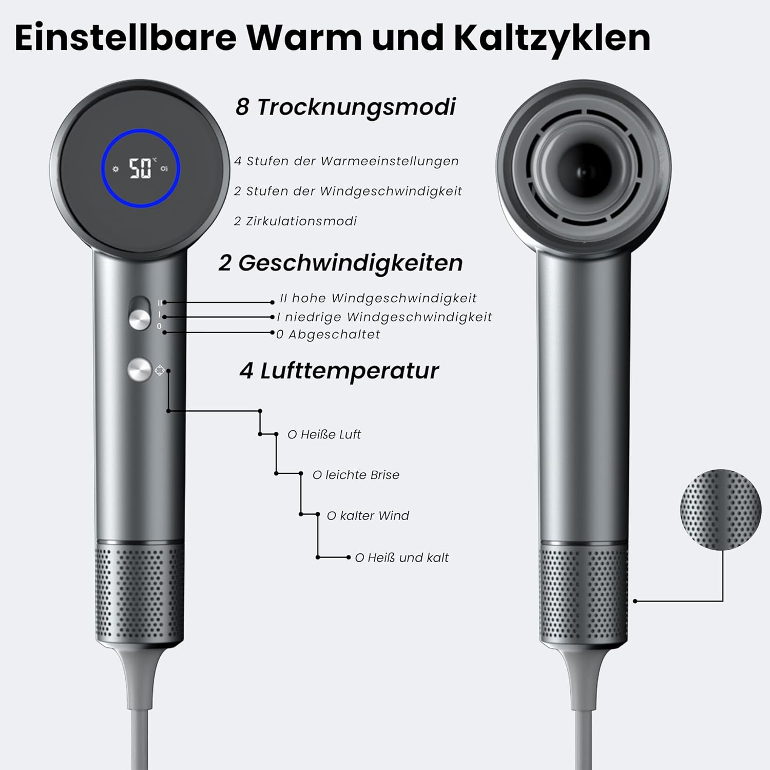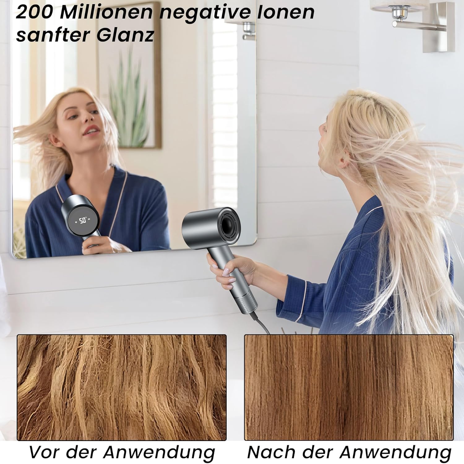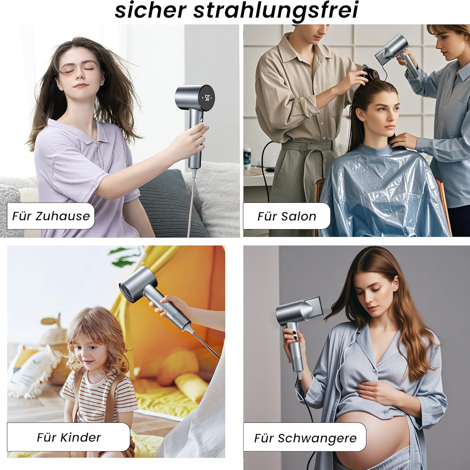 【تجفيف سريع في 5 دقائق】مجفف الشعر الأيوني مجهز بمحرك عالي السرعة بدون فرش يدور حتى 110000 دورة في الدقيقة ويولد سرعات رياح تصل إلى 22 مترًا في الثانية. يمكنها تجفيف شعرك بسرعة دون إتلافه.