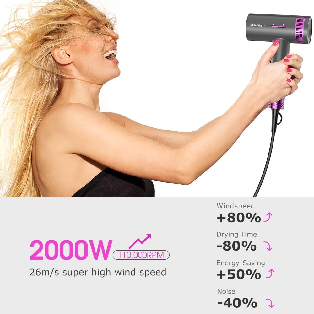 مجفف شعر ايوني عالي السرعة بقدرة 2000 واط مع 3 سرعات رياح و4 مستويات حرارة، مكثف ناعم، فوهة تصفيف للشعر المجعد بدون تجعد، سريع الجفاف