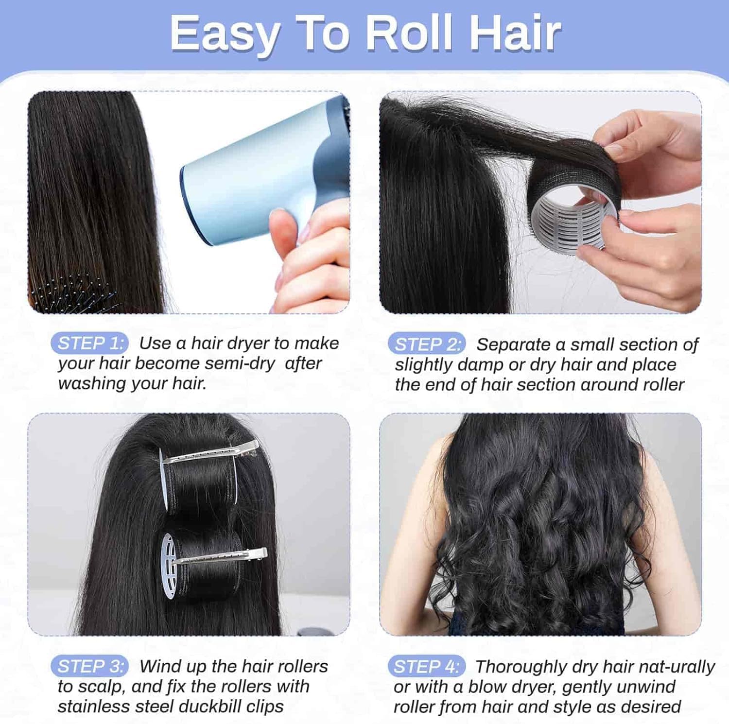 سهلة الاستخدام: استخدمي مشطًا لتنظيف جزء من الشعر الجاف بنسبة 70%-90% بلطف، ضعي أدوات تجعيد الشعر في طرف الشعر، ولفيها نحو فروة رأسك، ثم ثبتي بكرات الشعر بالمشابك، واستخدم منفاخ لتجفيف شعرك لمدة 10-15 دقيقة، واحتفظ ببكرات الشعر لمدة 15 دقيقة للسماح لها بالتبرد، ثم يمكنك الحصول على شعر مجعد ساحر. بكرات الشعر هذه سهلة التركيب والإخراج، ولا حاجة لأي أدوات أخرى، وتحمي شعرك من الحرارة أو التلف الكيميائي