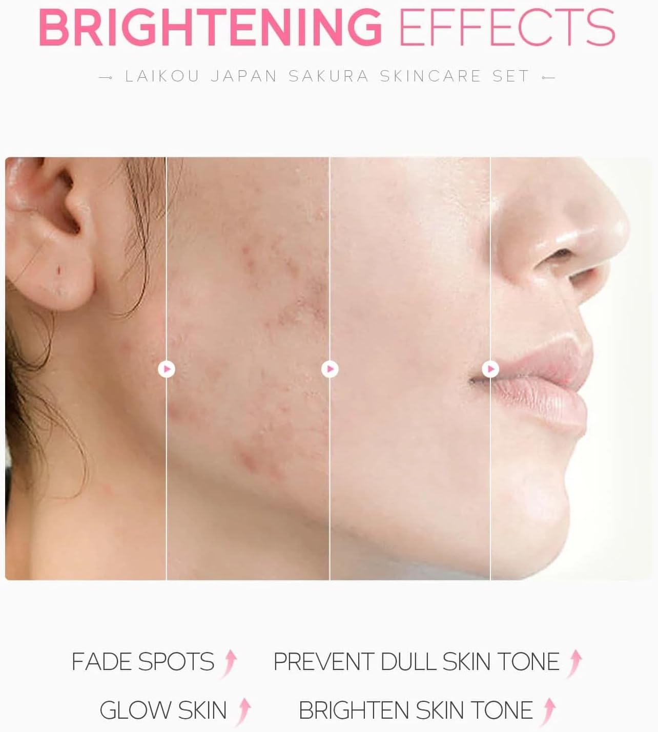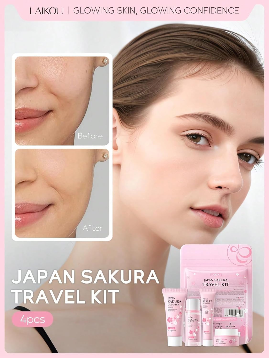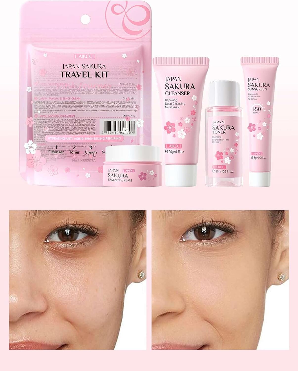 مجموعة سفر للعناية بالبشرة من جابان ساكورا لايكو مكونة من 4 قطع لتجديد البشرة بعامل حماية من الاشعة فوق البنفسجية بعامل حماية من الشمس 50+ 8 غرام وكريم مغذي للوجه 8 غرام وتونر تفتيح 20 مل ومنظف خفيف