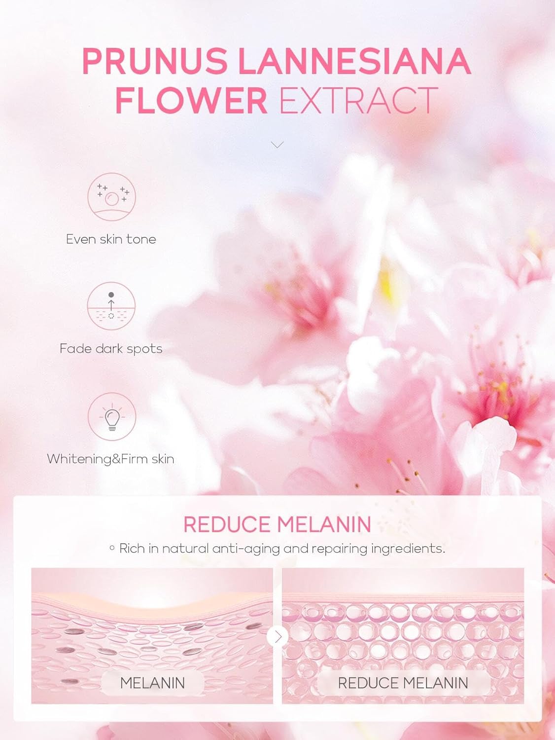 مستخلصات الساكورا: غني بمستخلصات الساكورا، والمعروفة بخصائصها المهدئة والمضادة للشيخوخة، مما يعزز الجمال الطبيعي لبشرتك.