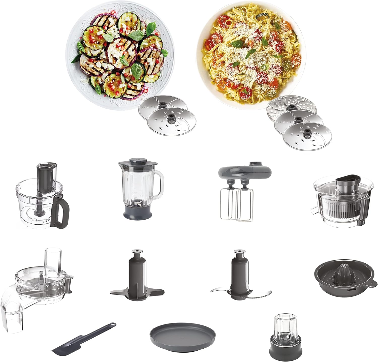الملحقات: وعاء بسعة 3 لتر، خلاط بسعة 1.5 لتر، مطحنة زجاجية متعددة الاستخدامات، عصارة للحمضيات، شفرة سكين، شفرة تقطيع إلى شرائح/ بشر قابلة للعكس 2 ملم، شفرة تقطيع إلى شرائح/ بشر قابلة للعكس 4 ملم، قرص بشر فائق النعومة، خفاقة معدنية مزدوجة، عصارة عصير، أداة عجين، ملعقة مسطحة، صينية لقياس الوزن.