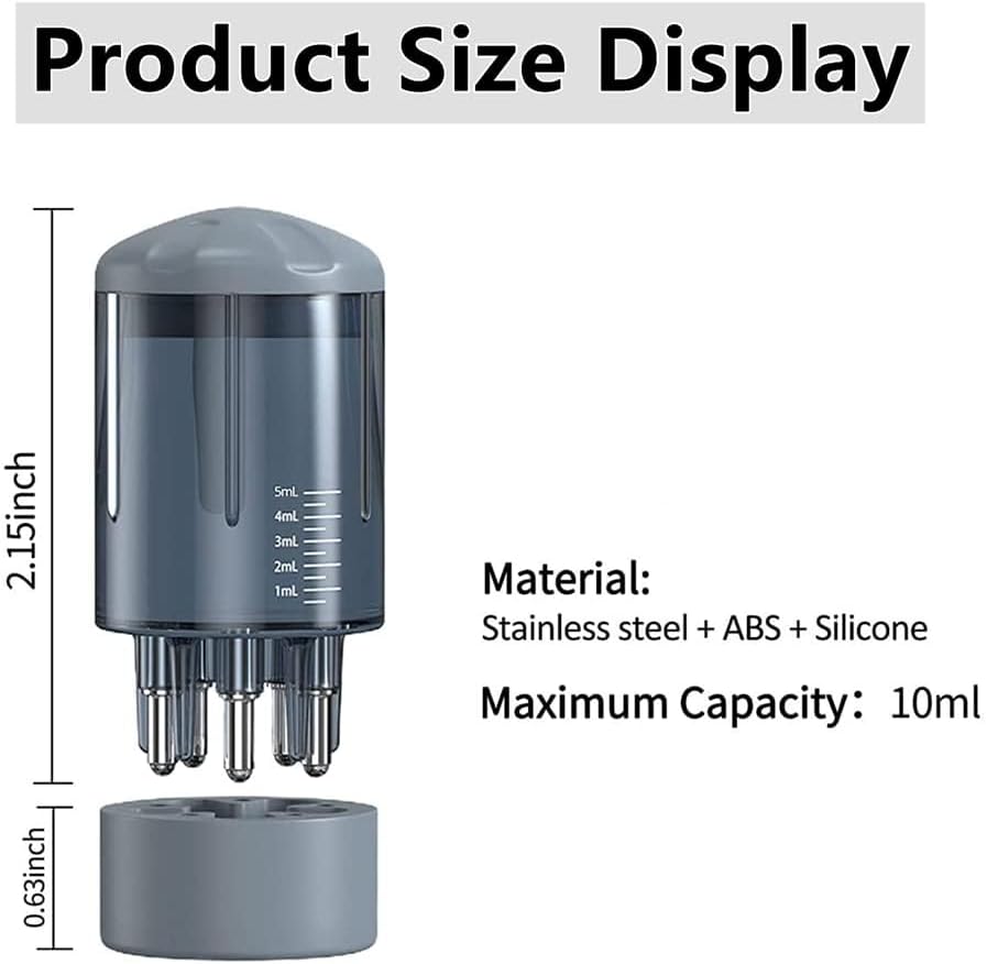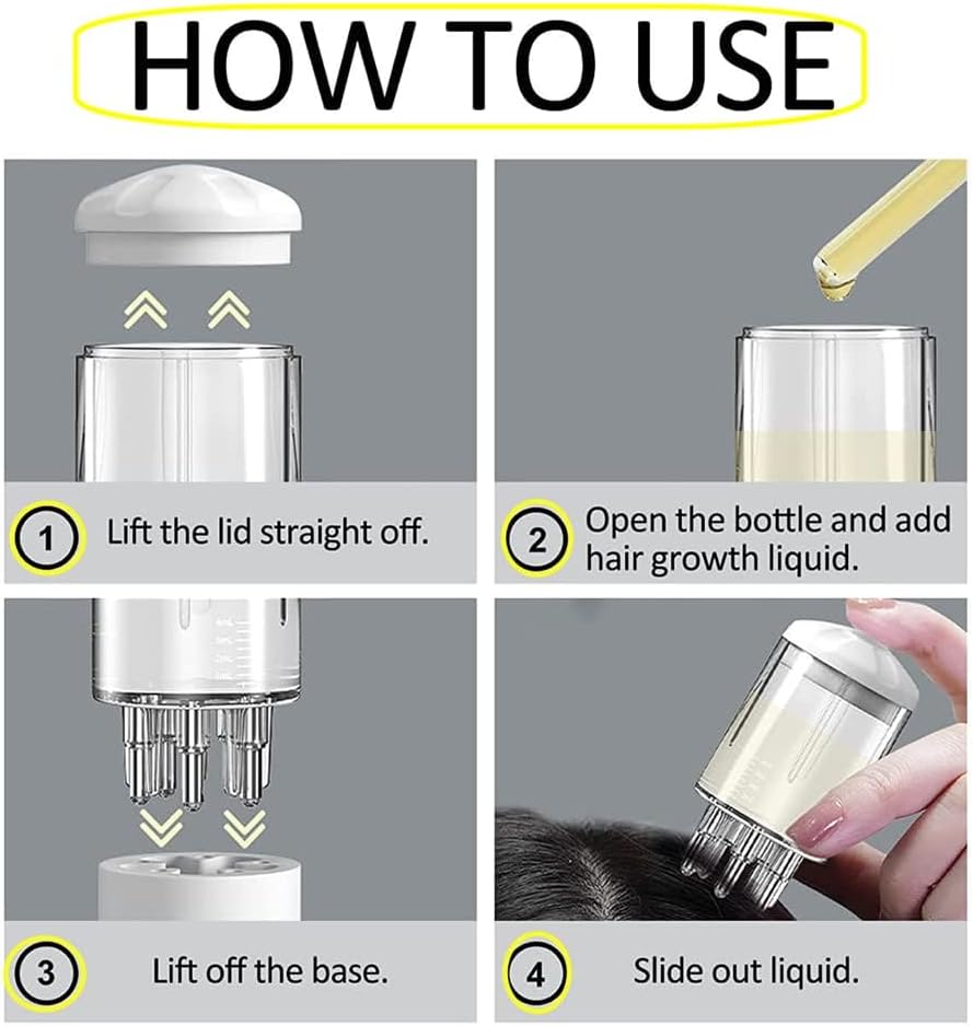 ملاحظة: 1. يتم توزيع الزيت بشكل تدريجي لذلك قد يحتاج إلى بعض الوقت لوضع كل شيء على فروة رأسك. 2. إذا كان زيتك سميكًا جدًا، فلن يكون متوافقًا بشكل خاص مع البكرات الصغيرة الموجودة على أداة التوزيع. تحتاج إلى تخفيف الزيت قبل سكب الزيت في الزجاجة.