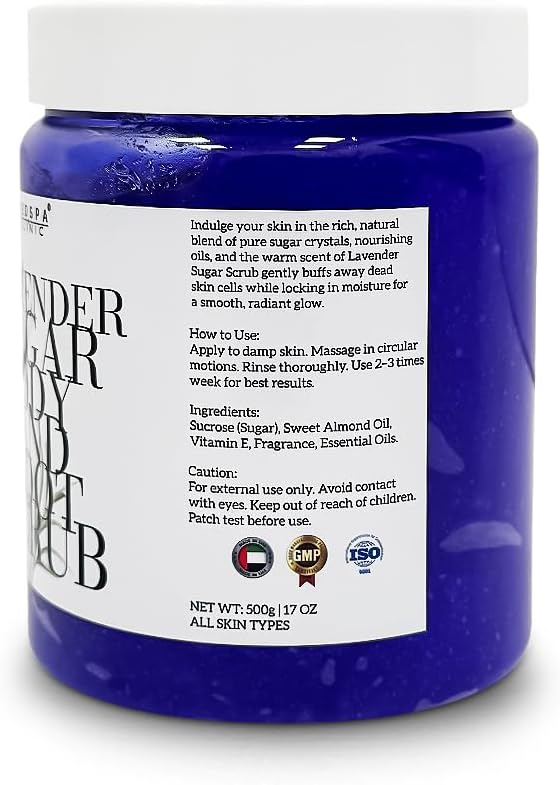 تقشير فاخر: مقشر سكر اللافندر الفاخر مصمم للعناية بالجسم والقدم على حد سواء، مما يوفر تقشيرًا لطيفًا وفعالًا لبشرة أكثر نعومة