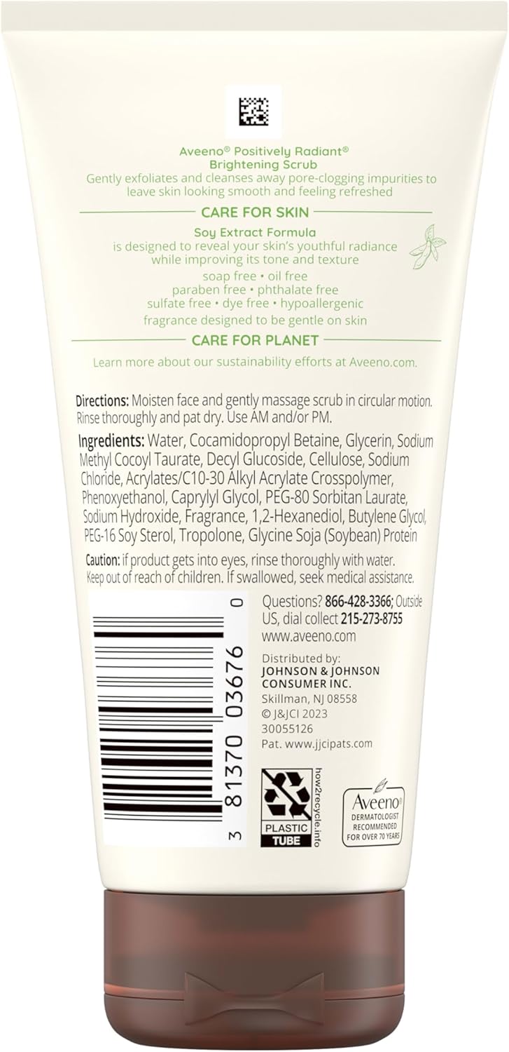 مقشر الوجه بوزيتيفلي راديانت من افينو، مقشر الوجه لتفتيح الوجه بخلاصة الصويا لتحسين لون البشرة وملمسها بشكل واضح، خالي من الزيوت والصابون، تركيبة مضادة للحساسية، 5 اونصة سائلة