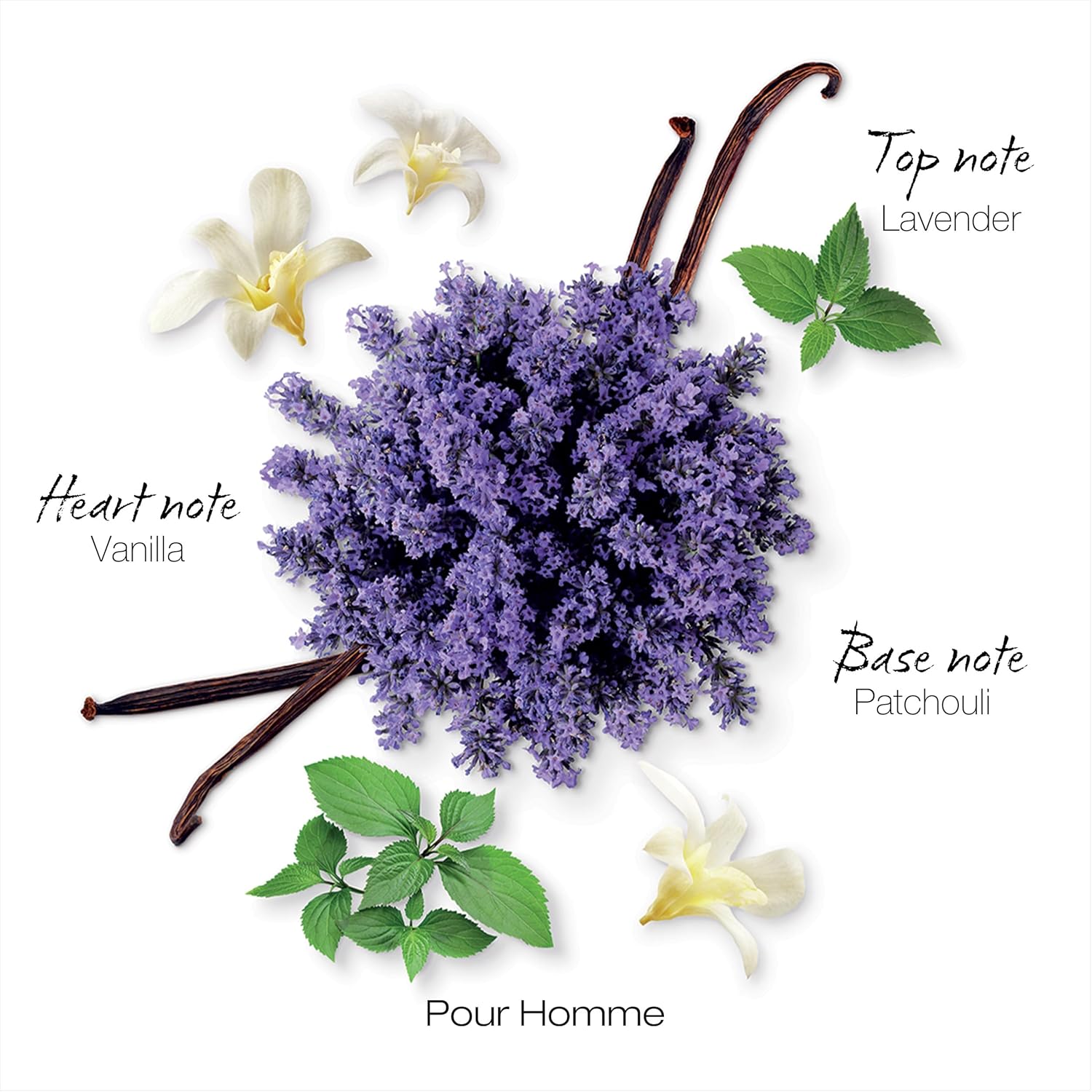 الروائح الأولية الخشبية والعطرية: الروائح الأولية: اللافندر. النفحات الوسطى: الفانيليا. المكونات السفلية: الباتشولي.
