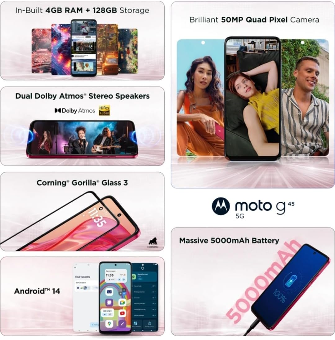 موتورولا G45 شبكة الجيل الخامس 5G (فيفا ماجنتا، ذاكرة رام 4 جيجابايت، تخزين 128 جيجابايت)
