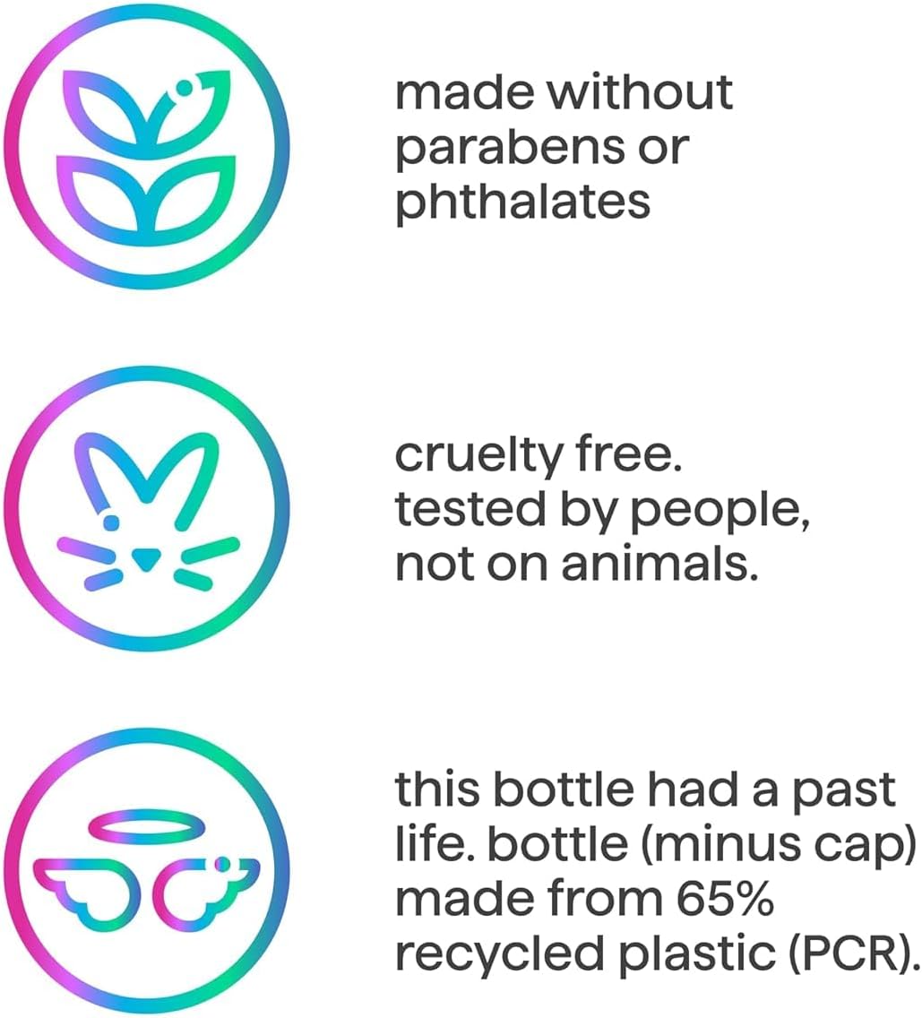 زجاجة (ناقص مضخة) مصنوعة من البلاستيك المعاد تدويره بنسبة 87% (PCR). لم يتم اختباره على الحيوانات. تم اختباره من قبل الأشخاص، وليس على الحيوانات.