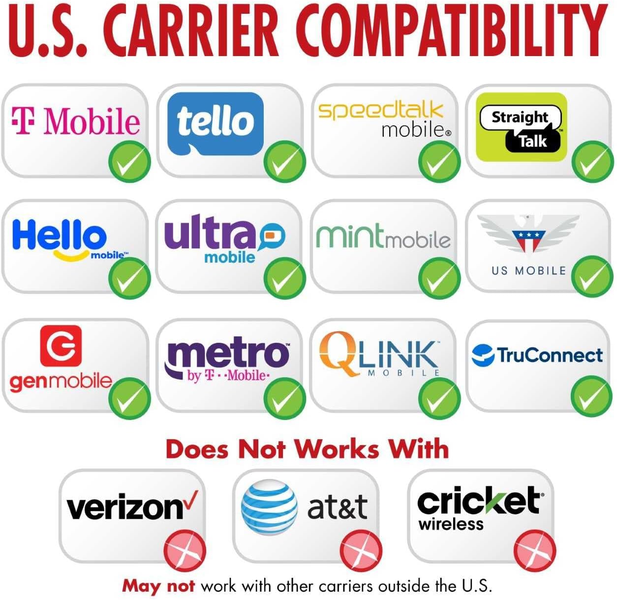 غير متوافق مع فيريزون، ايه تي اند تي، كريكيت. تعزيز الهاتف المحمول أو تراكفون أو بولس سيلولار أو يونيون وايرلس أو سبيكتروم أو أي حامل سي دي ام ايه في العالم. لمزيد من معلومات شركة الشحن، تواصل مع دعم العملاء لدينا.