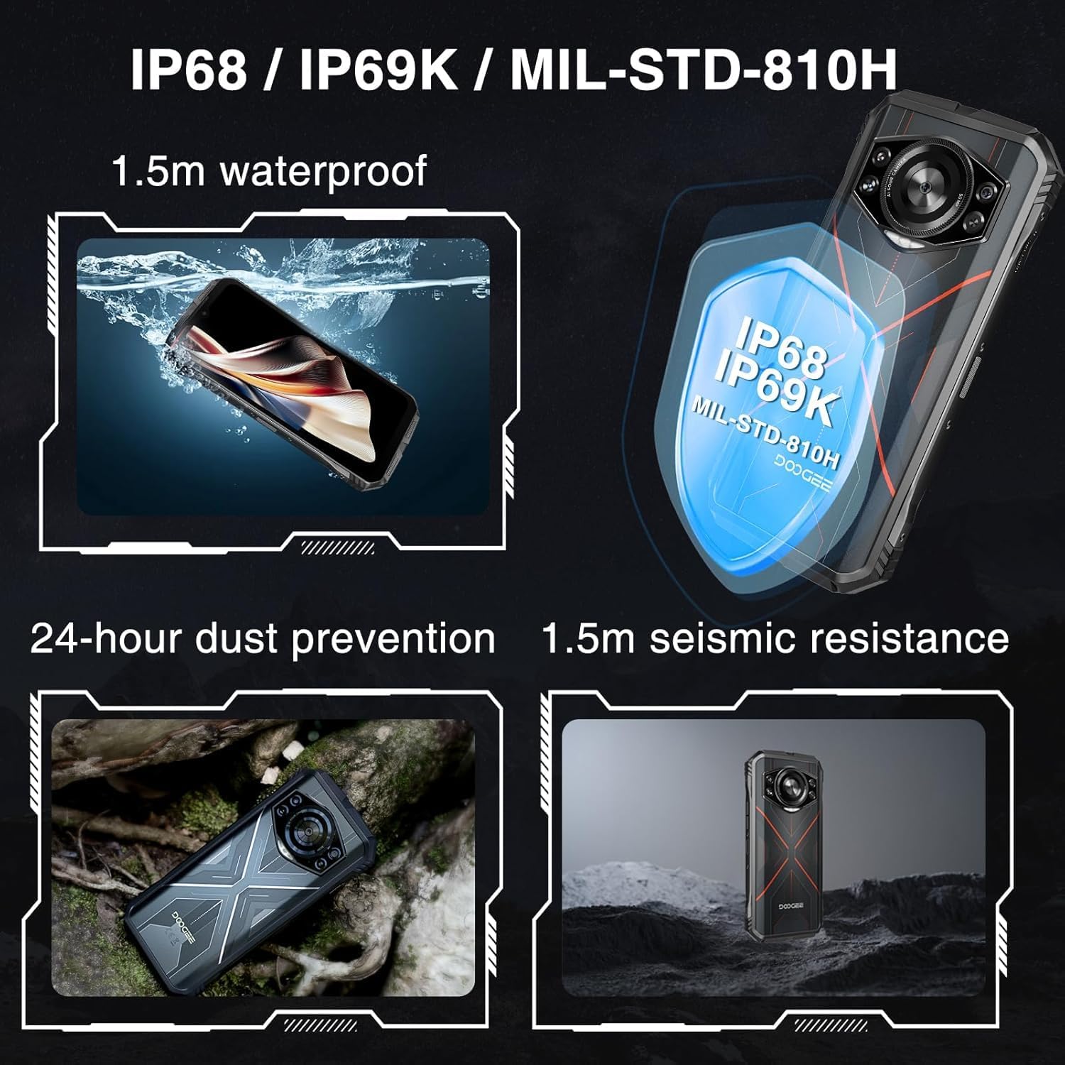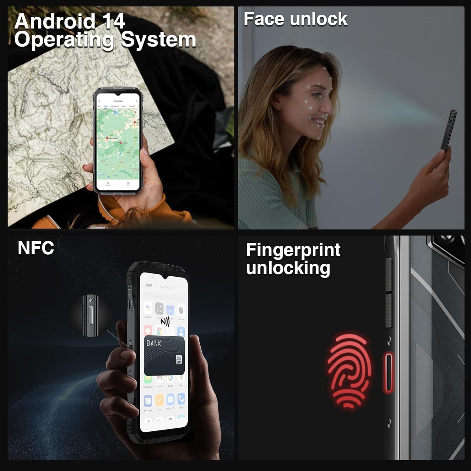 1. وحدة المعالجة المركزية: Spreadtrum T606, 12nm, 2 x A75 1.6GHz + 6 x A55 1.6GHz 2. وحدة معالجة الرسومات الجرافيكية: Mali-G57 GPU 3. الشاشة: 6.55 بوصة، 1080 × 2408 بكسل، معدل تحديث 90 هرتز، كثافة بكسل 401 بكسل لكل بوصة، نسبة الشاشة إلى الهيكل 85%، زجاج الجيل الثالث، 16.7 مليون لون، نسبة العرض إلى الارتفاع 20:9 4. نظام التشغيل: اندرويد 14 5. المستشعر: مستشعر التسارع، مستشعر القرب، مستشعر الإضاءة المحيطة، بوصلة (مغناطيسية)، المغناطيسية الأرضية، بصمات الأصابع (مثبتة على الجانب) 6. الذاكرة: 20GB+256GB DDR4X + UF 7. سعة التخزين: بطاقة تي اف تصل إلى 1 تيرابايت (غير متضمنة) 8. نوع شريحة الاتصال: شريحة اتصال نانو + شريحة نانو + بطاقة تي اف (ثلاثة اختيار اثنين) 9. منفذ الشحن وسماعة الأذن: نوع سي 10. واي فاي: 2.4G/5G (802.11ac/a/b/g/n) 11. بلوتوث: V5.0 12. تمركز: Beidou, Galileo, Glonass, GPS 13. اف ام: يدعم 14. او تي جي: يدعم الشحن العكسي 15. ان اف سي: يدعم 16. البطارية: 10800mAh 17. الأبعاد: 178.5×83.1×17.9 ملم 18. الوزن: 365 غرام 19. الحماية: IP68 / IP69K / MIL-STD-810H كاميرا مقاومة للماء والغبار والصدمات: 1. الكاميرا الخلفية: 50 ميجابكسل+5 ميجابكسل 2. الكاميرا الأمامية: 16 ميجابكسل 3. وظيفة الكاميرا: خلفي: HDR ، وضع احترافي ، فيديو ، صورة ، رمز الاستجابة السريعة ، الجمال ، الرؤية الليلية ، الترا الدقة ، فلتر ، مضاد للوميض ، Potrait ، GIF ، بانوراما ، علامة مائية ؛ أمامي: علامة مائية ، فيديو ، صورة ، مضاد للوميض ، الجمال ، Potrait ، المرآة ، مصراع الابتسامة العصابات الشبكية: 1. جي اس ام: B2/B3/B5/B8 2. WCDMA: B1/B2/B4/B5/B8 3. TDD: B34/B38/B39/B40/B41 4. FDD: B1/B2/B3/B4/B5/B7/B8/B18/B19/B20/B25/B26/B28AB/B66 5. يدعم 4G VoLTE، محتويات العبوة: 1. 1 × 2 هاتف محمول. كابل USB نوع سي × 1 3. شاحن × 1 4. غشاء مضاد للانفجار (مثبت مسبقًا) × 1 5. غشاء مضاد للانفجار 6. صندوق تعبئة × 1 7. دليل الاستخدام × 1 8. 1 × بطاقة ضمان