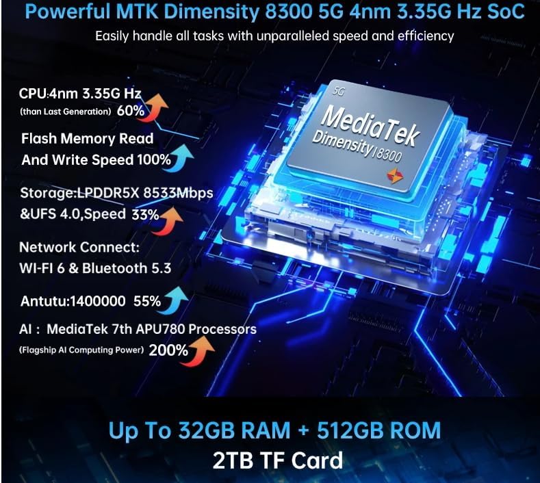 أول جهاز عرض ذكي 8300 وحدة المعالجة المركزية 3 كيه اموليد 100 لومن/دقة 1280 × 720 شاشة اموليد 6.75 انش | بطارية 11600mAh، ضوء LED متعدد الاستخدامات للتحذير في حالات الطوارئ 3200*1440 شاشة AMOLED تدعم واي فاي 6، بلوتوث 5.4 ميديا تيك ديمنستي 8300/3.35GHz/5 G/4mn Up إلى 32/GB RAM (16+16GB افتراضية)، 512GB ROM اندرويد 14، ان اف سي، قاذف الأشعة تحت الحمراء، كاميرا تحت الماء، وضع القفازات، الكاميرا الخلفية الرئيسية: كاميرا خلفية 50 ميجابكسل، مستشعر كبير للغاية 1/1.3 انش، مستشعر GN1 CMOS، 1.2 ميكرومتر، 7 قطع عدسة، مجال رؤية 85 درجة، ƒ/1.95 كاميرا أمامية كبيرة ::32MP ثنائي ثنائي مكبر صوت ببطارية كبيرة 11600 مللي امبير في الساعة، شحن سريع 120 واط 5G/4G/3G/2G *غير متوافق مع ايه تي اند تي، كريكيت، سبرينت، بوست موبايل، كودو، تيلوس وايرلس، فيدو*لم يتم عرض بعض شبكات الشبكات لأن شبكات الجيل الخامس الخاصة بها ليست قيد الاستخدام التجاري الجماعي بعد. إذا كنت قد شاركت في برنامج اختبار شركة الاتصالات هذا، يرجى التحقق مع شركة الاتصالات حول ترددات الجيل الخامس التي يستخدمونها، حتى تتمكن من التحقق مما إذا كان يونيهيرتز شارك 3 يدعم شبكتهم. 5G: 5G NR Sub6: N1/2/3/5/7/8/20/25/28/38/40/41/66/71/77/78/79 4G: FDD-LTE: B1/2/3/4/5/7/8/12/13/17/18/19/2 0/25/ 26/28A/28B/66/71 TDD-LTE: B32/B34/38/39/40/41 الجيل الثالث: WCDMA: B1/2/4/5/6/8/19 2G: GSM: B2/3/5/8 CDMA: BC0/BC1/BC10