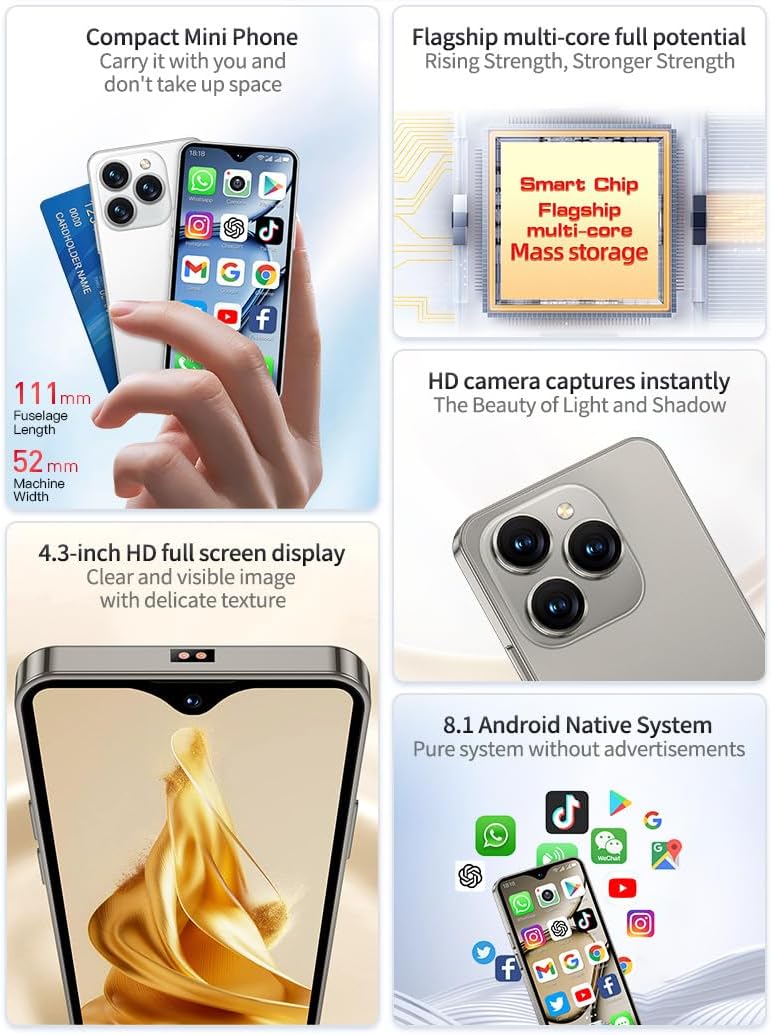 شاشة كاملة HD مقاس 4.3 انش: يختلف عن الهواتف الصغيرة الأخرى، يستخدم هذا الهاتف الذكي الصغير شاشة كاملة مع شاشة رئيسية أكبر. تصميم الشاشة مقاس 4.3 انش أكثر ملاءمة للاستخدام اليومي.