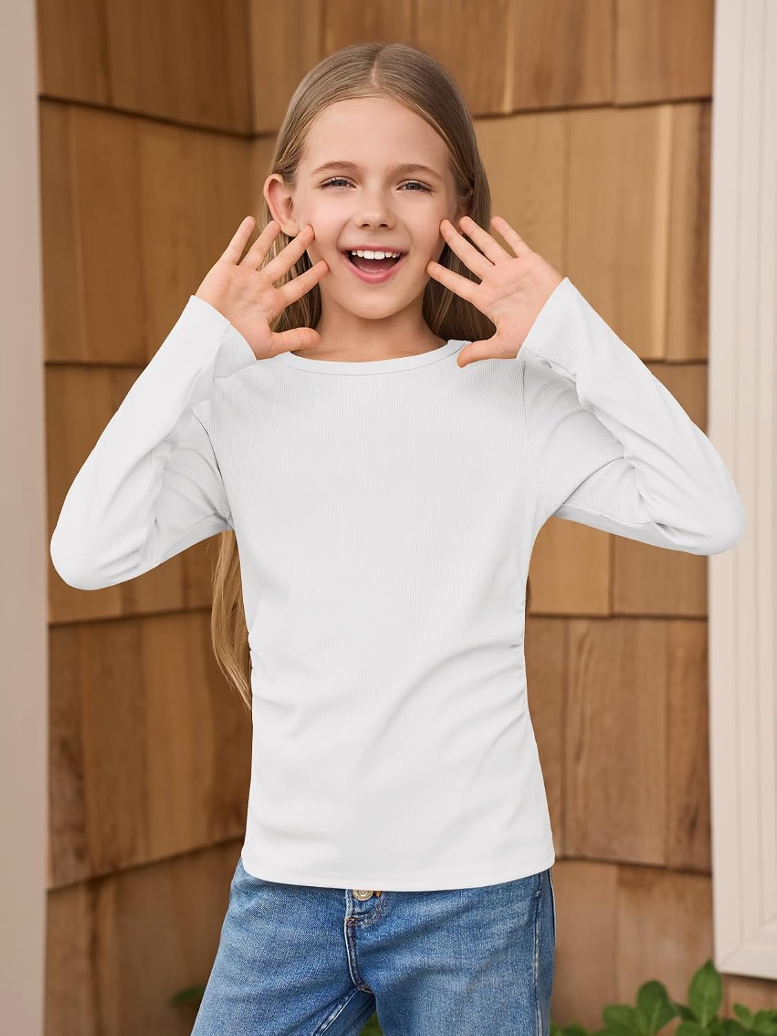 هالو مونينغ قمصان باكمام طويلة ورقبة دائرية ضيقة مكشكشة جانبية مضلعة كاجوال للبنات بعمر 4-15 سنة