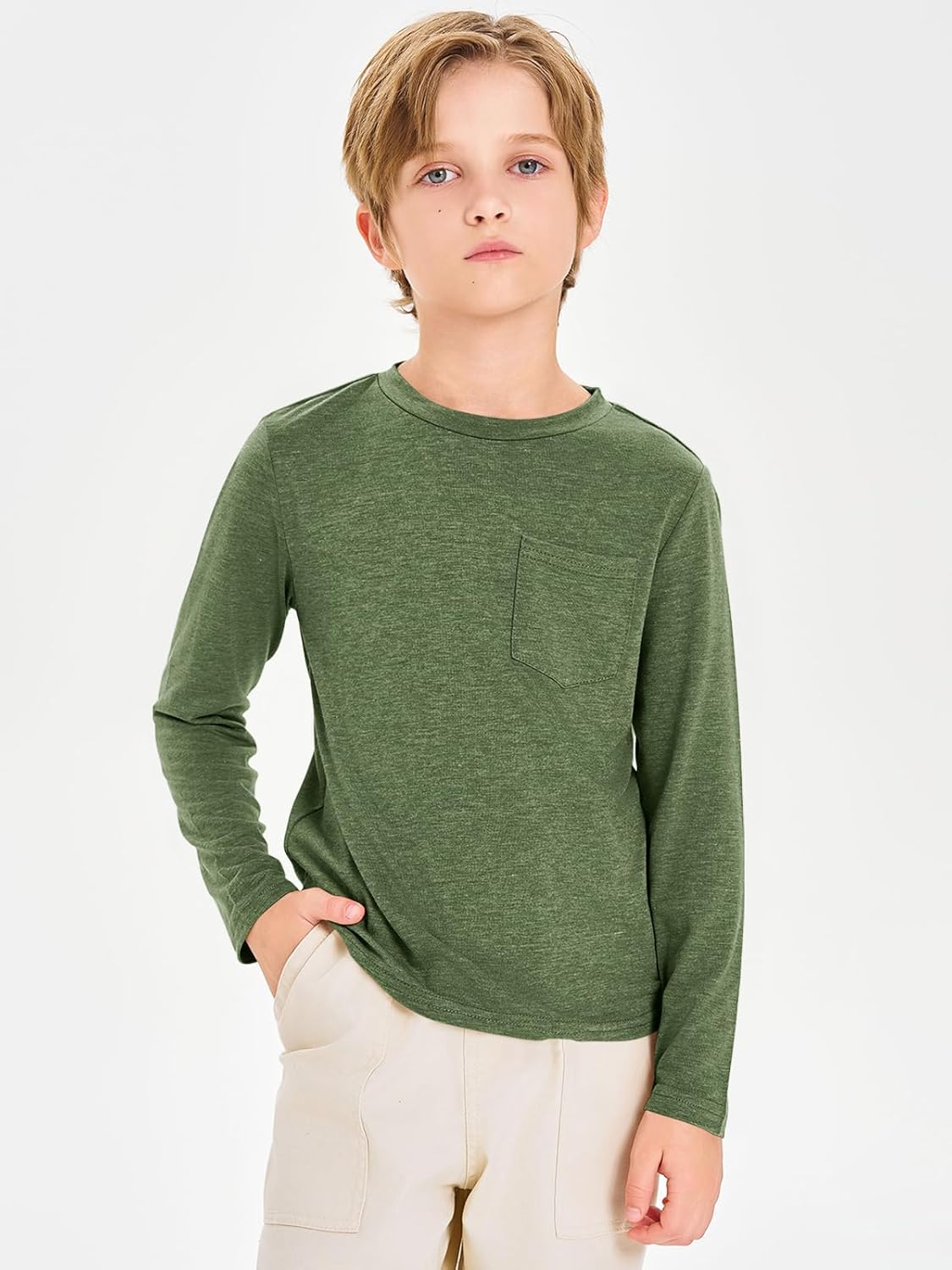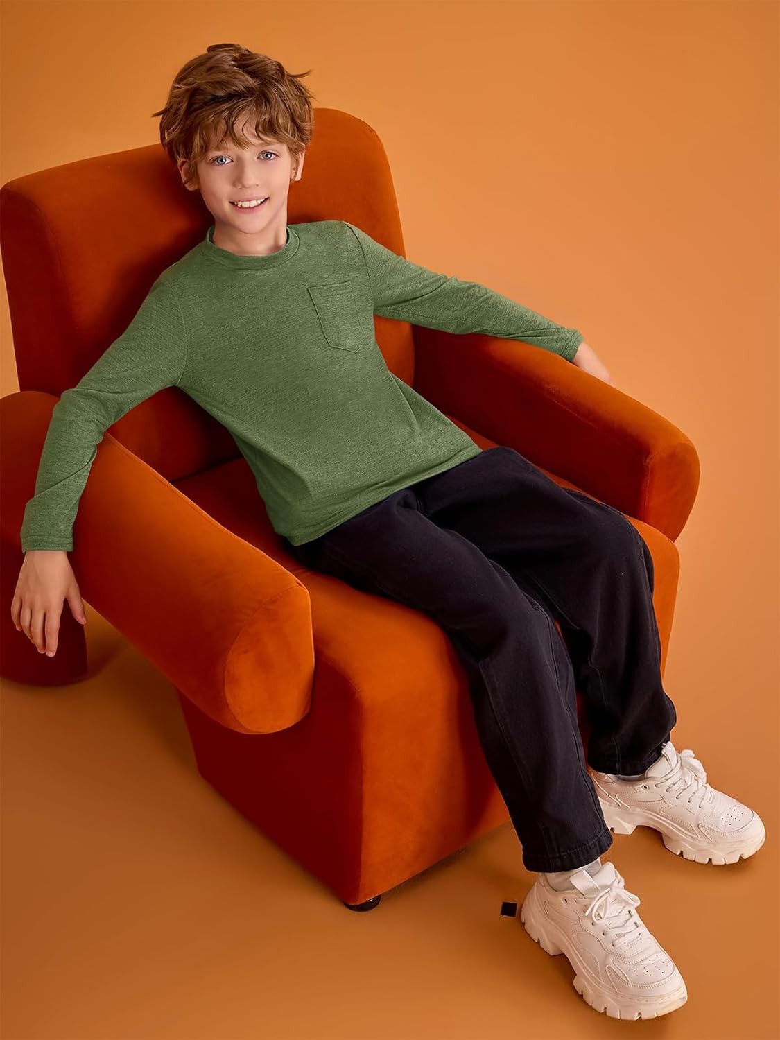 هالو مونينغ قمصان للاولاد باكمام طويلة ورقبة دائرية ضيقة كاجوال مع جيب على الصدر لعمر 5-14 سنة