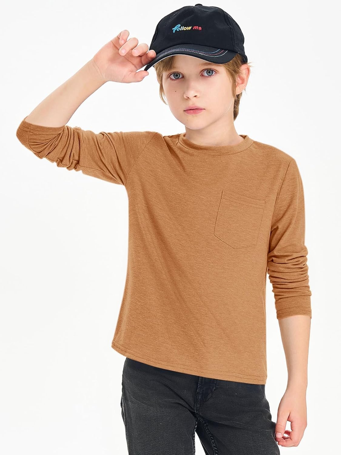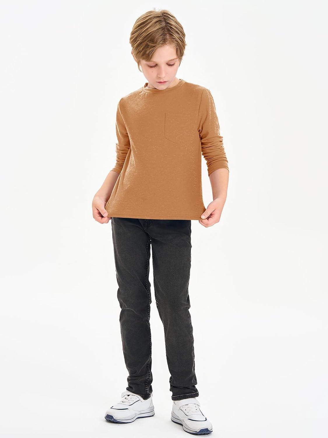هالو مونينغ قمصان للاولاد باكمام طويلة ورقبة دائرية ضيقة كاجوال مع جيب على الصدر لعمر 5-14 سنة