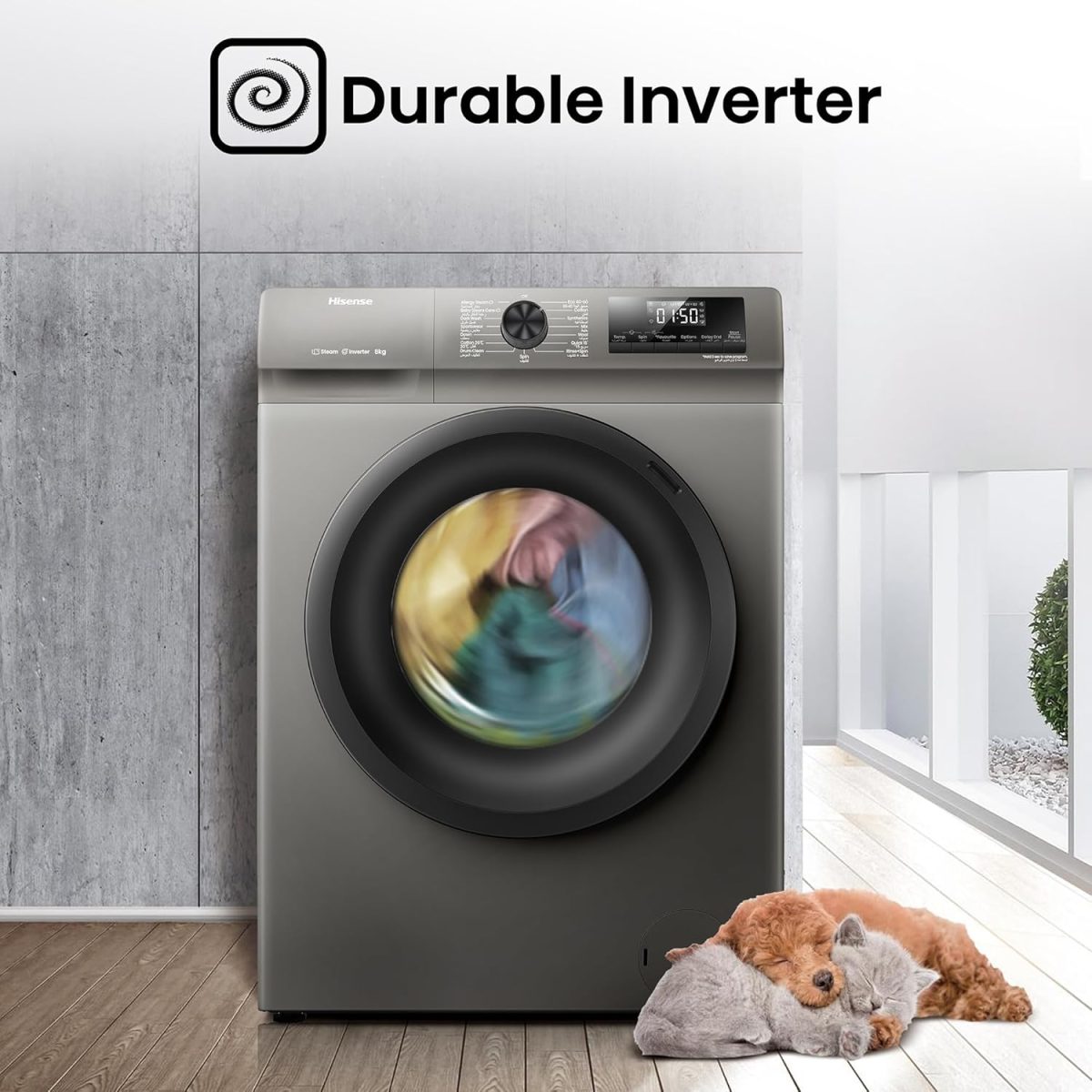 هايسينس غسالة WFQP8012T سعة 8 كجم تحميل امامي نحيف، محرك عاكس 1200 دورة في الدقيقة، غسيل سريع، وظيفة الإيقاف المؤقت والإضافة، عناية بالبخار للحساسية، رمادي تيتانيوم