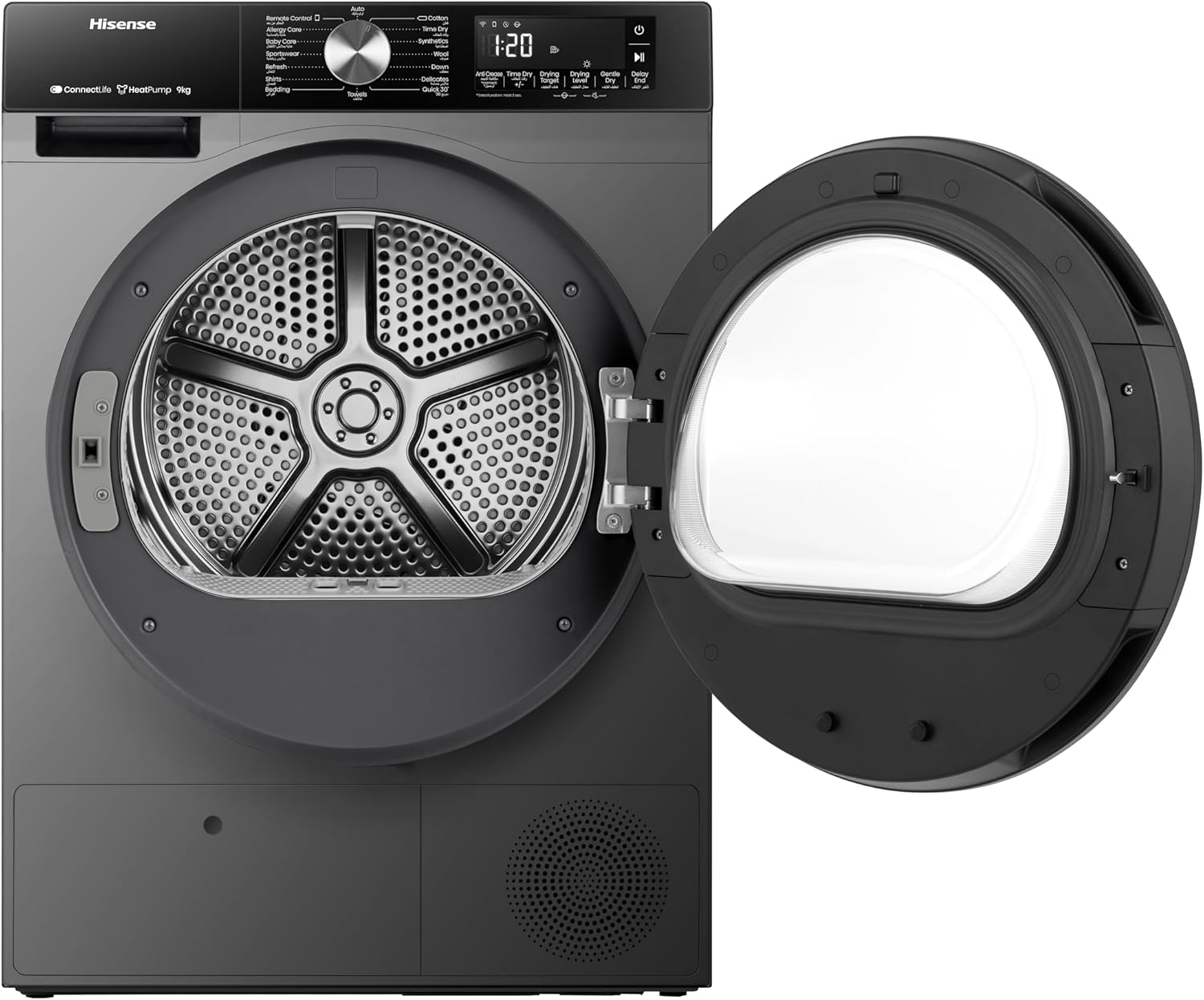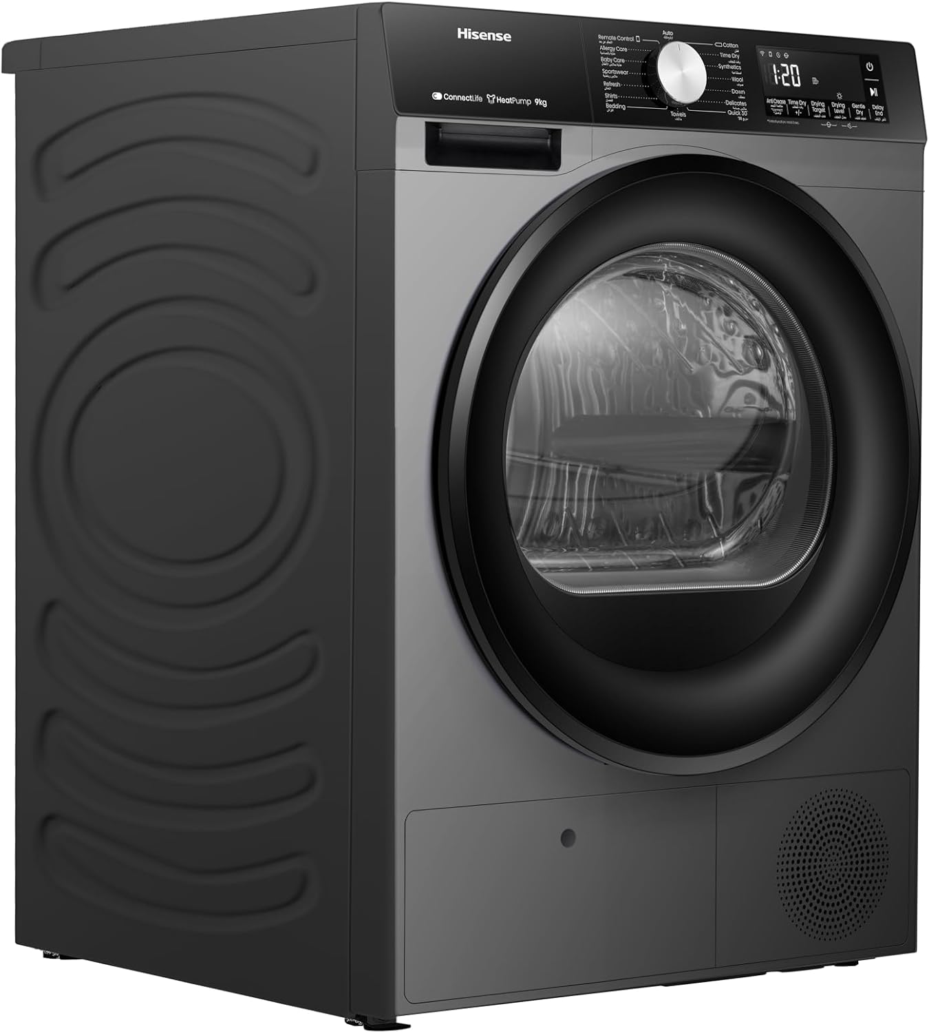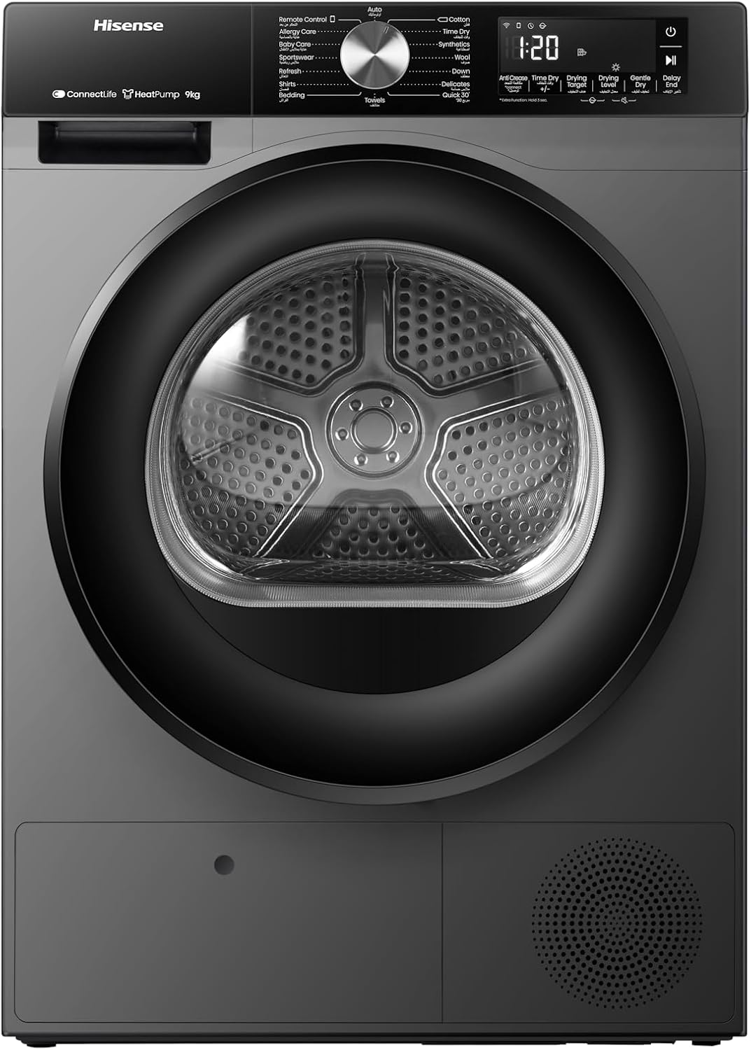 هايسينس مجفف بمضخة حرارية 9 كجم مع اتصال واي فاي، 15 برنامج، تجفيف بالذكاء الاصطناعي، العناية بالحساسية، مضاد للتجعد، غسيل سريع، تنظيف الاسطوانة، DH3S902BT
