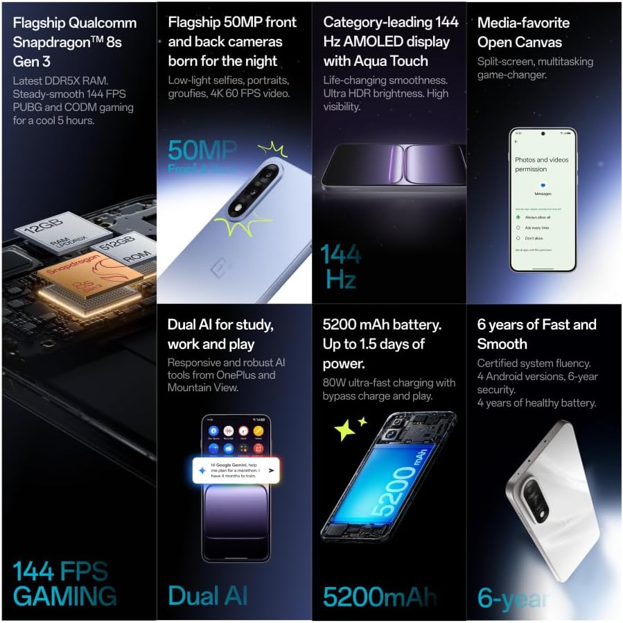 هاتف ذكي 5G مع كاميرا 50 ميجابكسل، بطارية 5200 ميلي امبير في الساعة وشحن سريع 80 واط | شاشة اموليد 144 هرتز | سناب دراجون 8s الجيل الثالث | موبايل للتصوير الفوتوغرافي والألعاب والفيديو بدقة 4 كيه، استمتع بأداء راقي مع هذا الهاتف الذكي 5G المزود بكاميرا 50 ميجابكسل، تقريب رقمي 0.6x – 20x وتسجيل فيديو 4K. مثالية لعشاق التصوير الفوتوغرافي ومنشئي المحتوى واللاعبين. بطارية 5200 مللي أمبير في الساعة مع شحن سريع سوبرفوك 80 واط تضمن الاستخدام طوال اليوم. مع شاشة سناب دراجون 8 اس الجيل الثالث وشاشة اموليد 144 هرتز، يوفر هذا الهاتف ألعابًا سلسة وتعدد المهام وأكثر من ذلك – دون ارتفاع درجة الحرارة بفضل الشحن الزائد.