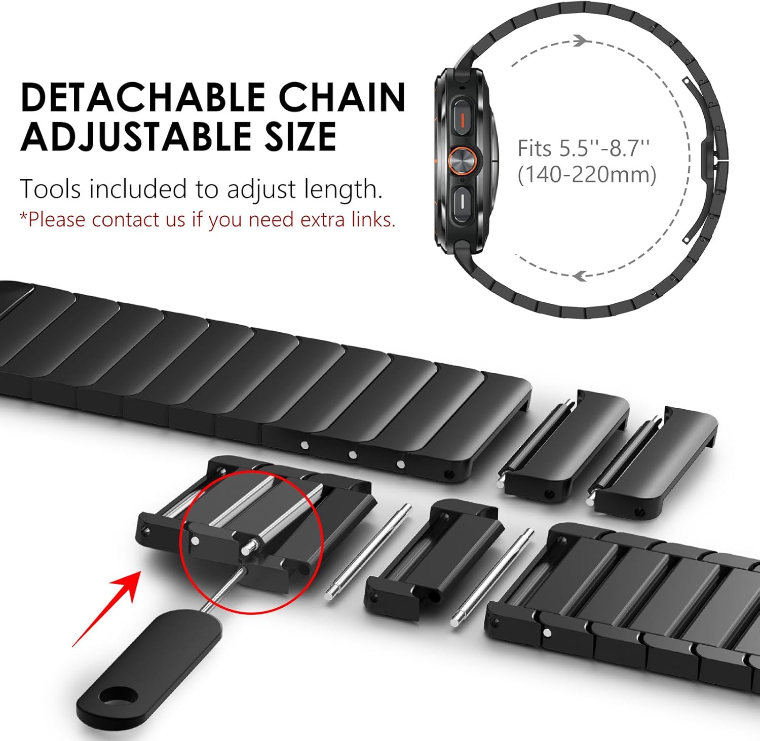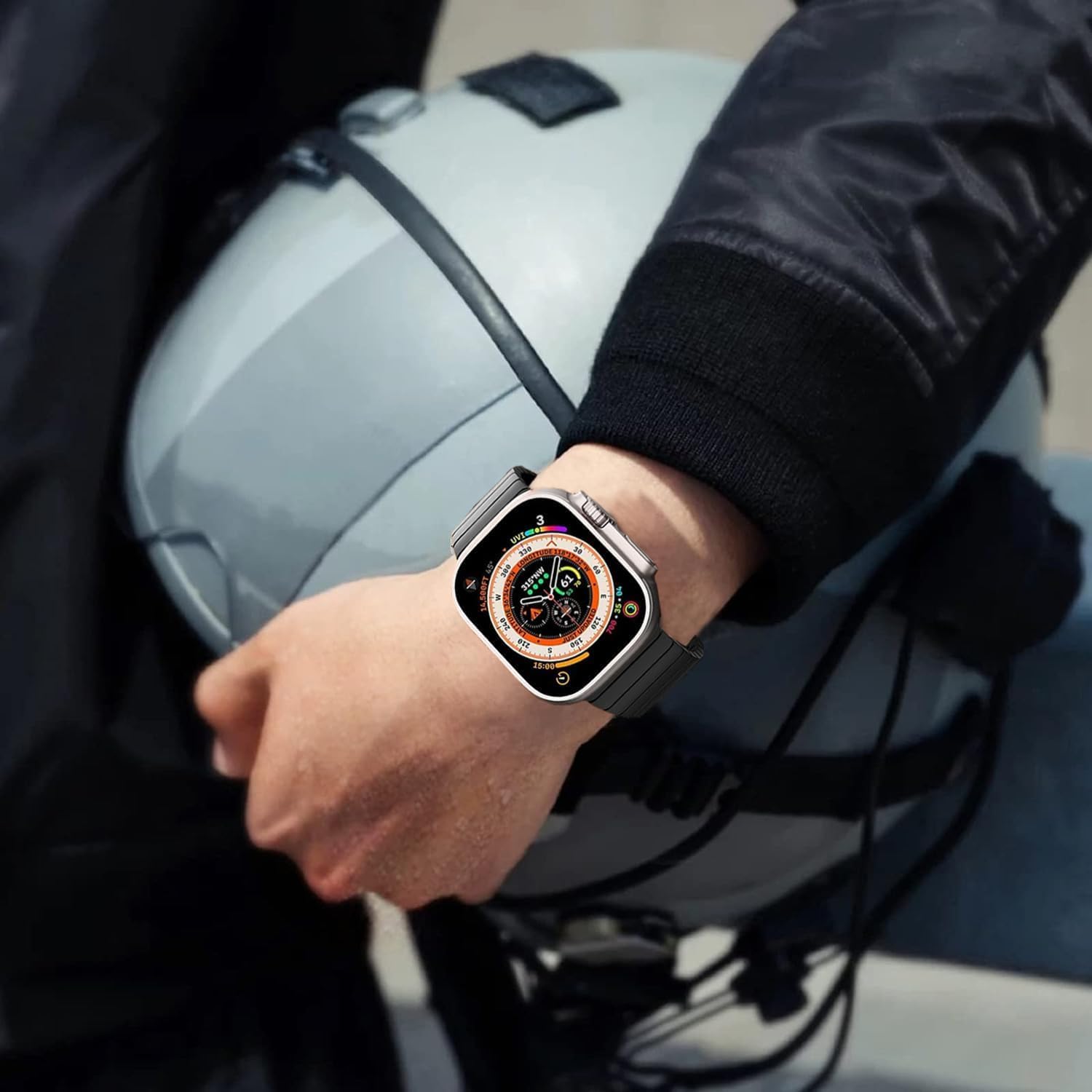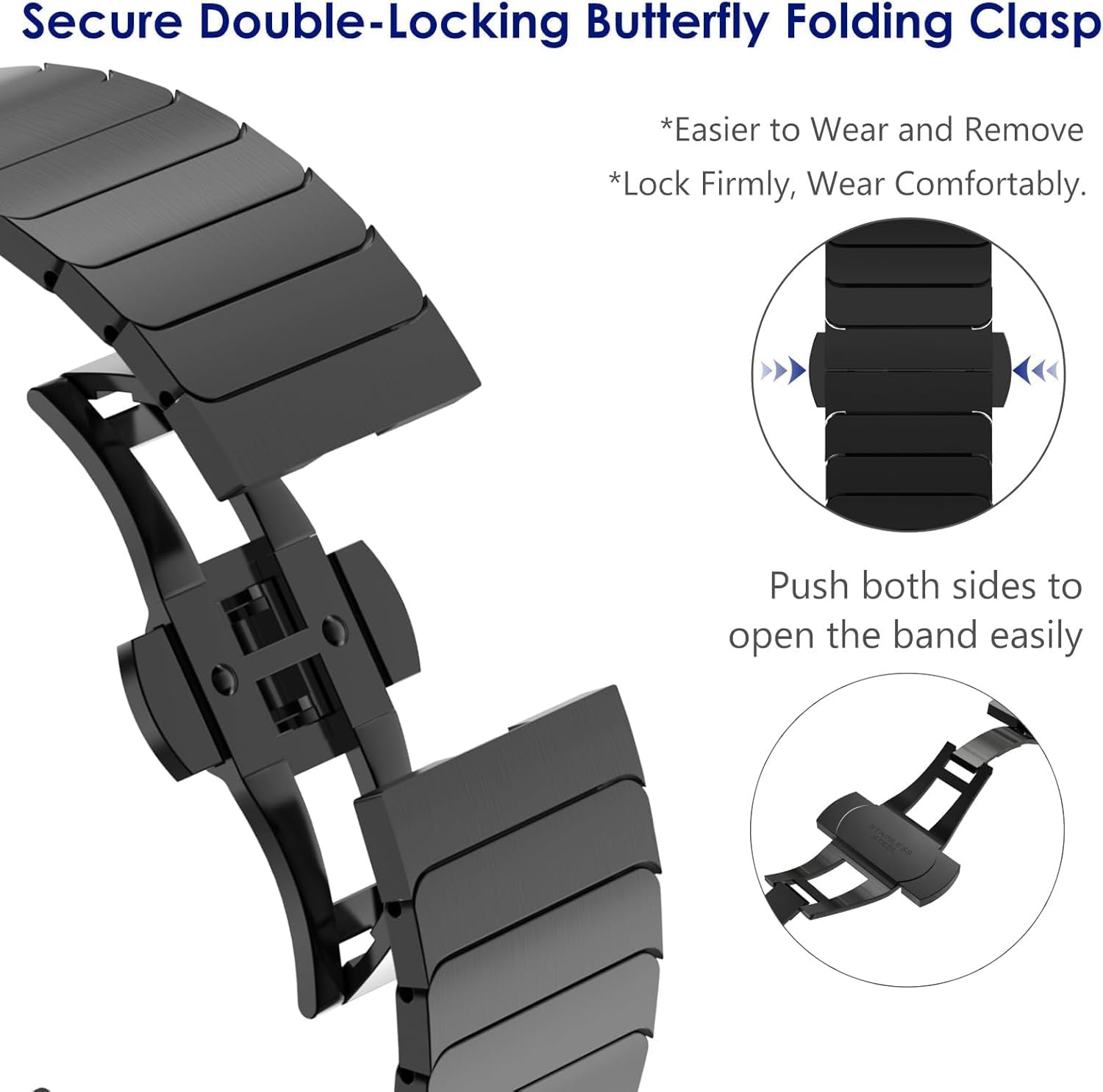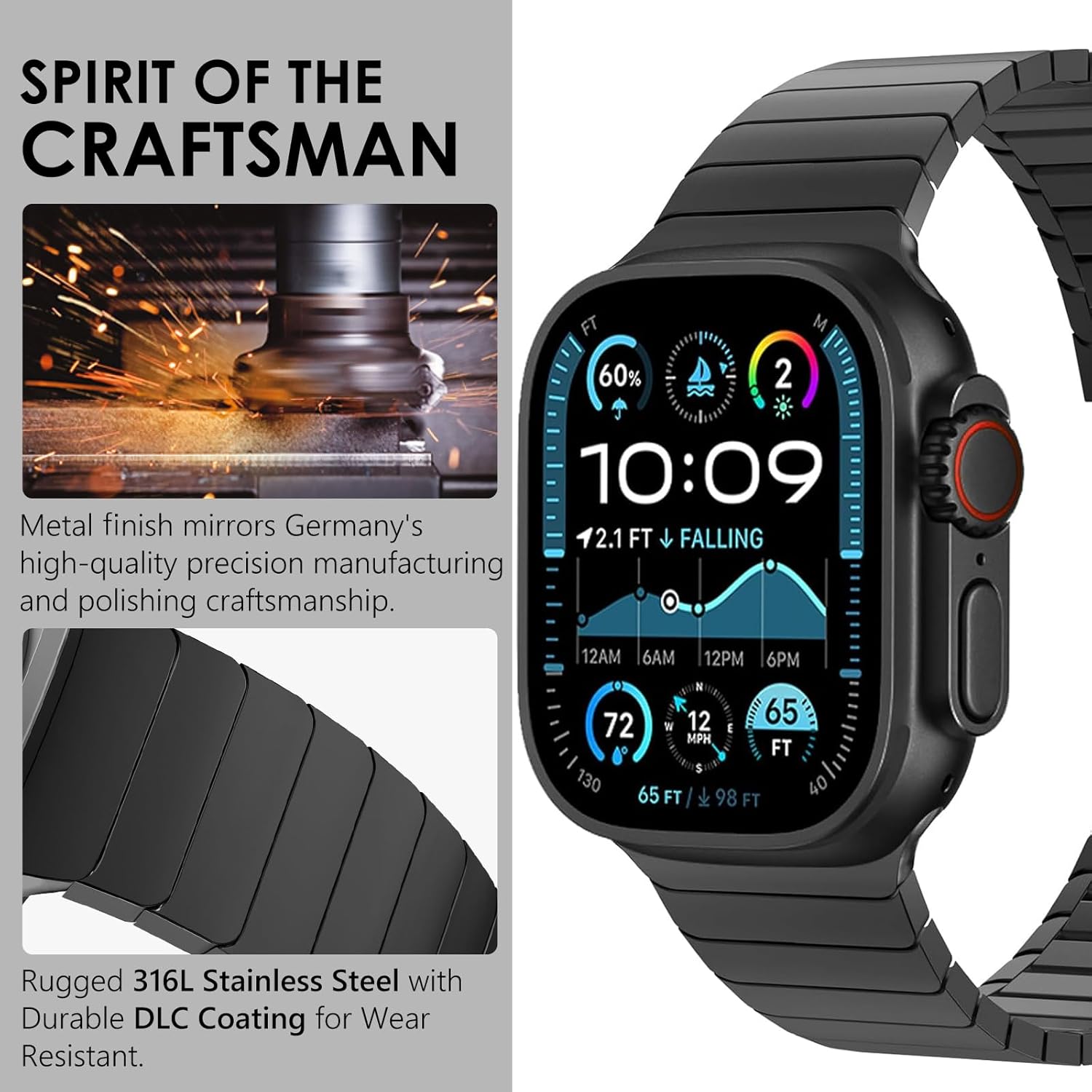 [سوار فاخر من الستانلس ستيل مع طبقة طلاء دي ال سي]: نفس اللون مع ساعة ابل الترا / الترا 2 السوداء. مصنوعة من مادة الستانلس ستيل المصقول بالساتان مع طلاء كربون يشبه الماس (DLC) لمقاومة عالية للتآكل والخدش، مصنوعة من عملية تلميع وطلاء كهربائي رائعة. تصميم الخطوط القوية والنظيفة مع لمسة نهائية لامعة للسوار يجعل جمالية بسيطة وأكثر وضوحًا.