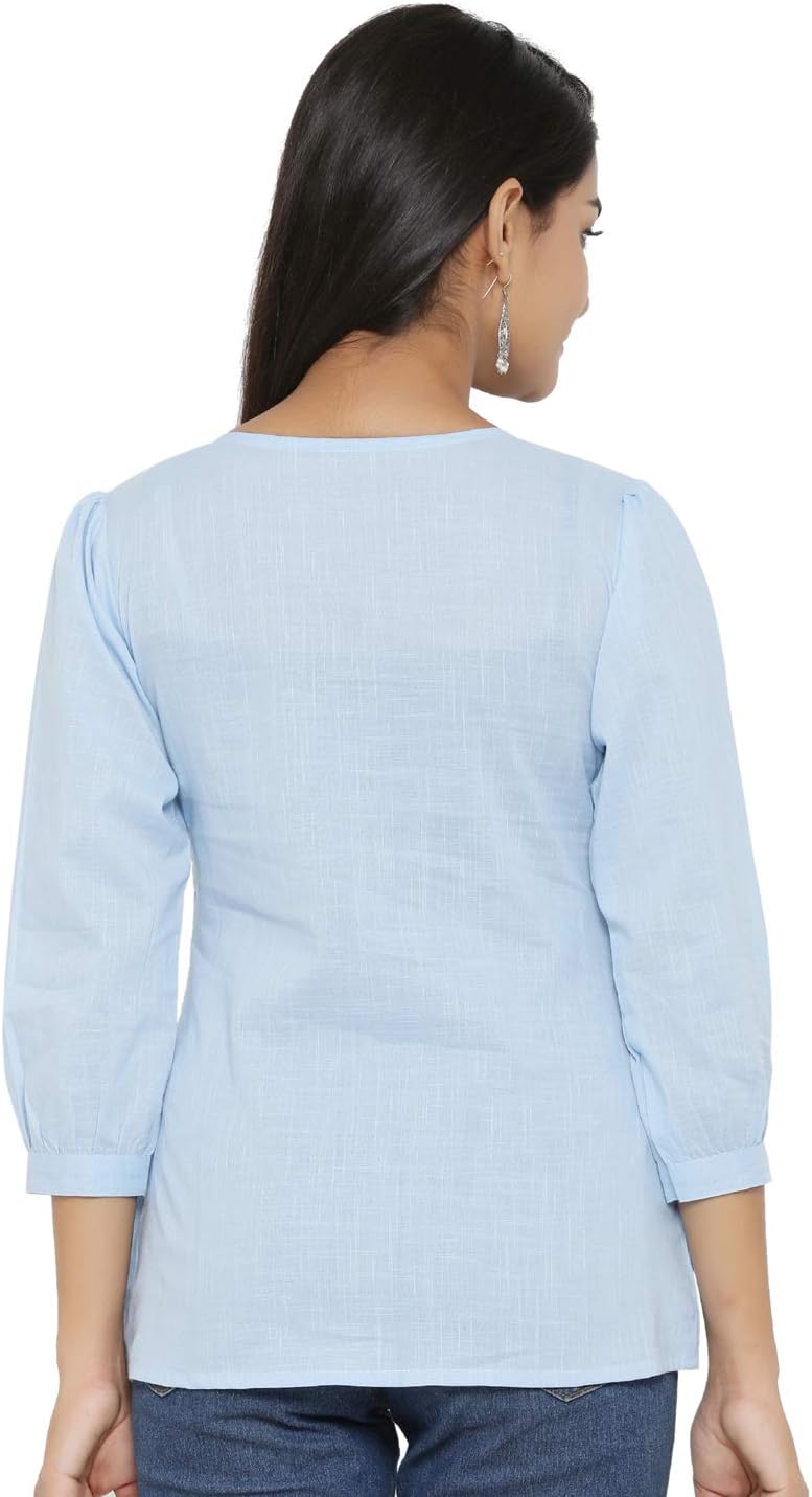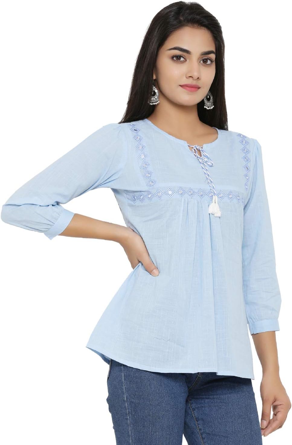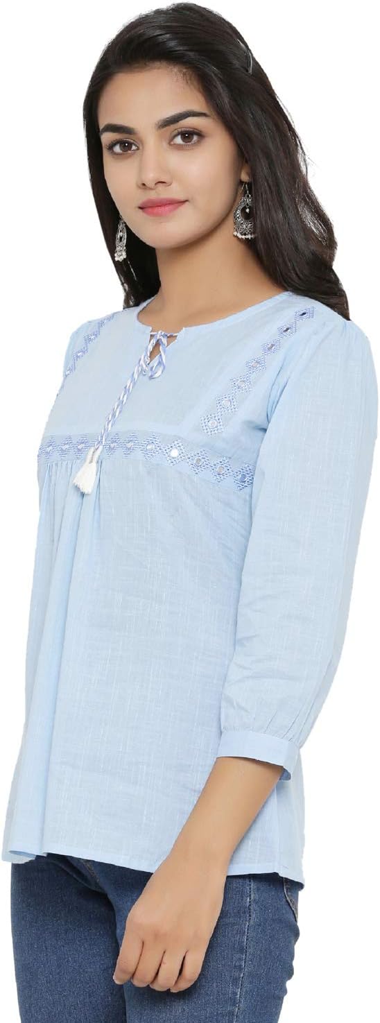 ياش غاليري بلوزة قطنية مطرزة للنساء (ازرق فاتح، مقاس L)