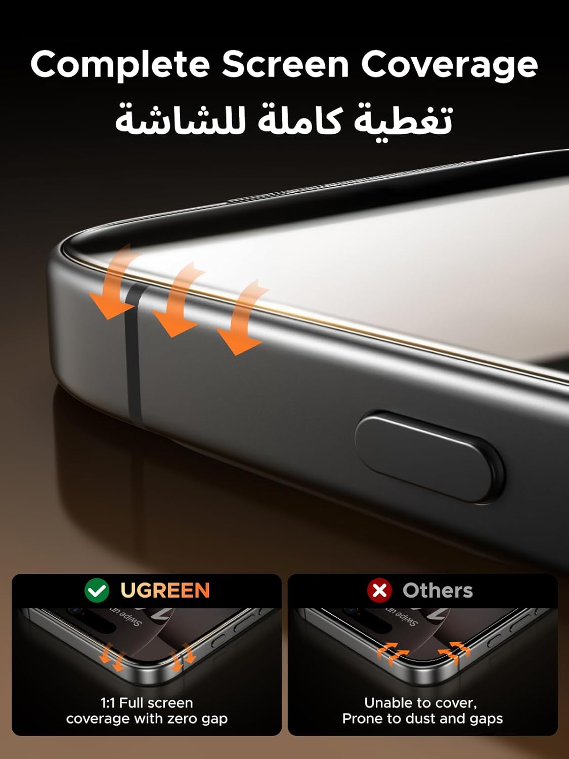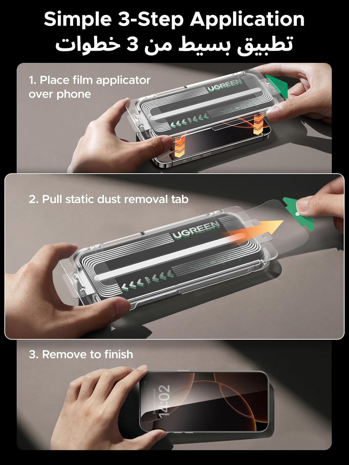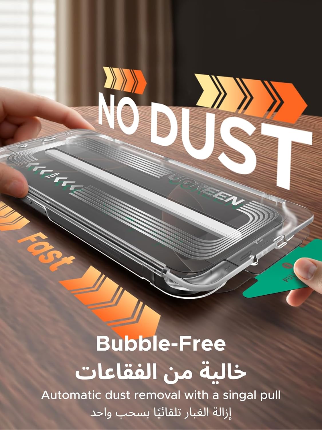 【تركيب سهل وسريع】فقط التقط واسحب —UGREEN نظام إزالة الغبار سيتولى الباقي. لا حاجة لإزالة الفقاعات يدويًا ولا لضبط الزوايا. تركيب مثالي بحركة واحدة