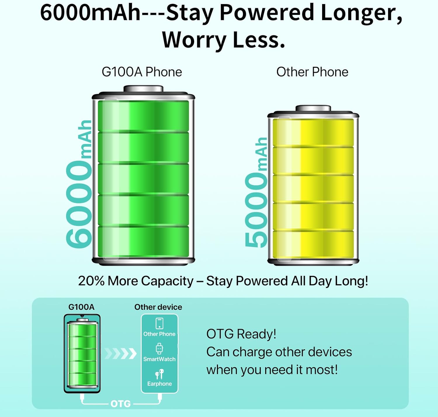 نظام تشغيل اندرويد 14، مما يعزز الخصوصية والأداء: يعمل الهاتف الخلوي G100A بنظام اندرويد 14، مما يعزز الخصوصية والأداء. يتميز بشريحة يونيسوك T615 ثمانية النواة، مبنية على عملية 12 نانومتر للحصول على طاقة منخفضة وعمر بطارية طويل وتسريع الذكاء الاصطناعي ودعم LTE