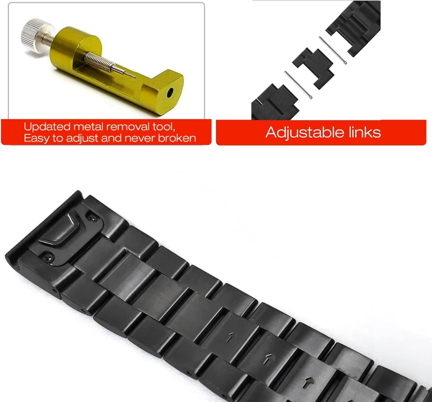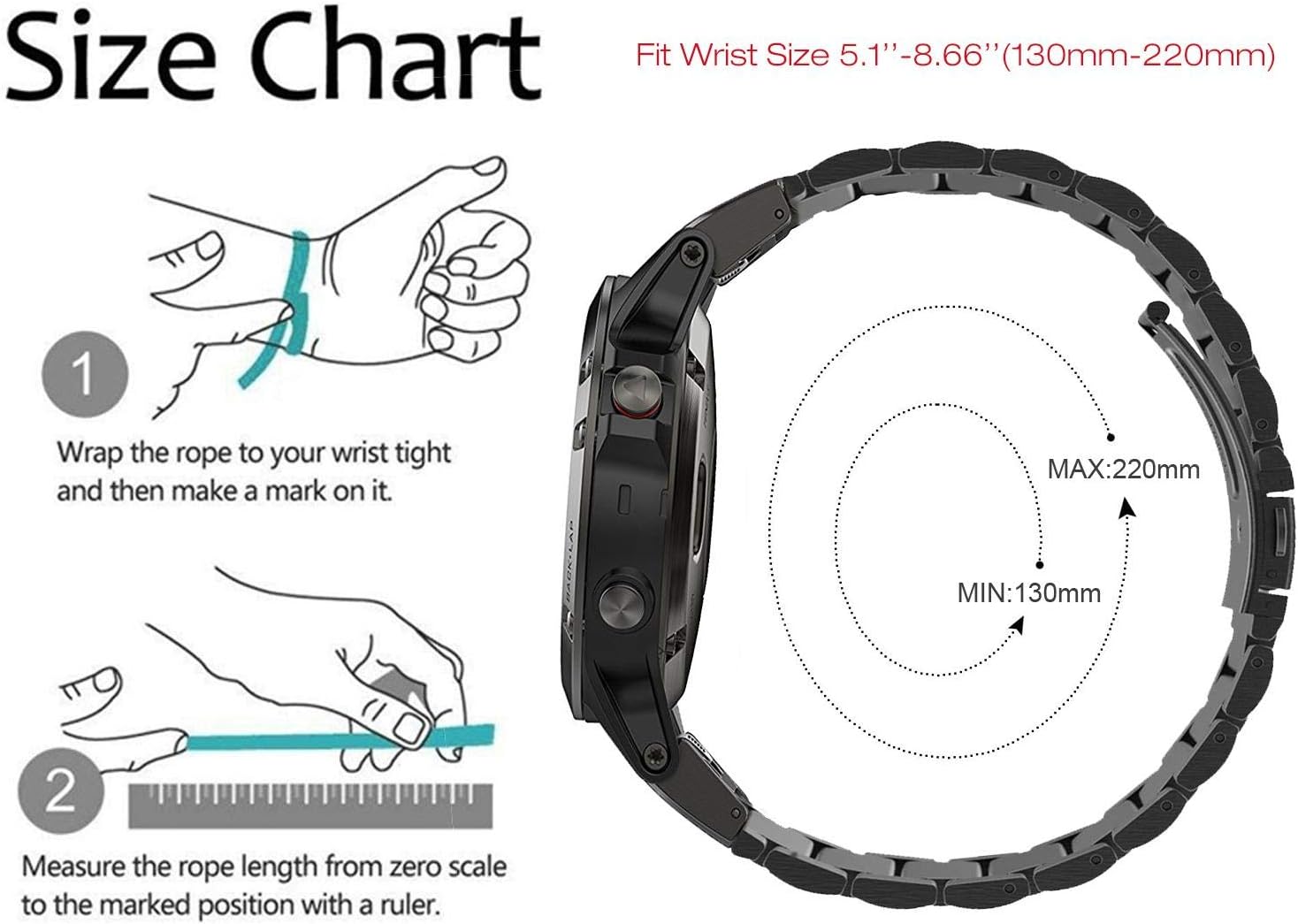 يناسب مقاس المعصم 130 ملم – 220 ملم. تأتي العبوة مع أداة إزالة واحدة ودليل لضبط طول السوار. يرجى اتباع الدليل لضبط الوصلات،
