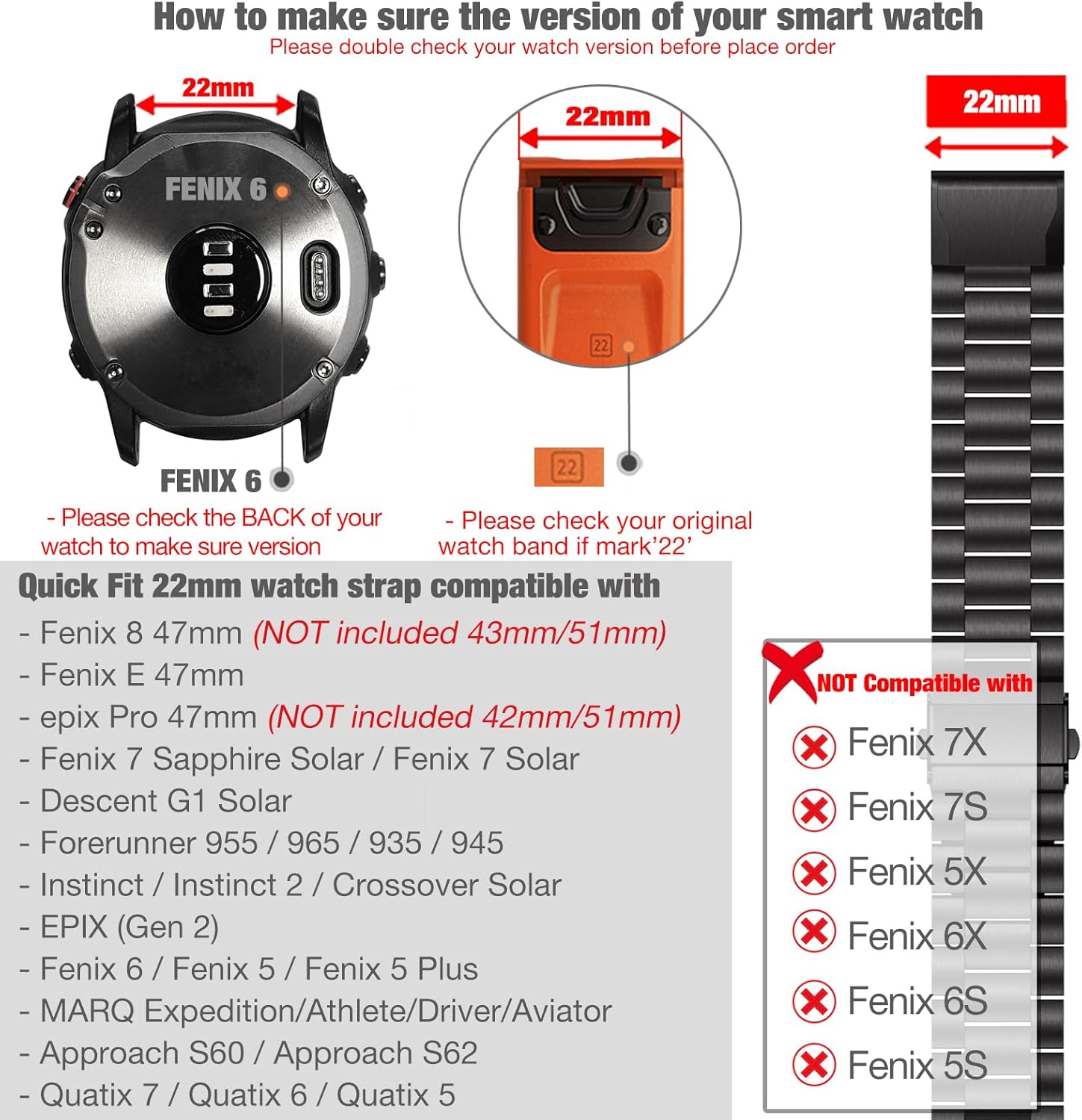 ▲نصائح: يرجى التحقق من سوار الساعة الأصلي الخاص بك إذا كانت علامة “كويك فيت 22″، إذا لم يكن كذلك، يرجى عدم تقديم الطلب، متوافق مع جارمين فينيكس 7 سافير سولار / فينيكس 7 سولار، فور رنر 955، ديسنت جي 1، فينيكس 5 / فينيكس 5 بلس، فينيكس 6 برو/سافير، ابروتش S60/S62، كواتيكس 5/كواتي السابق انر 935/945، انستينكت 2 سولار. !! غير متوافق مع ساعة فينكس 5 اكس / 6 اكس / 7 اكس أو 20 ملم فينكس 5 اس / 6 اس / 7 اس، الساعة الذكية غير متضمنة.