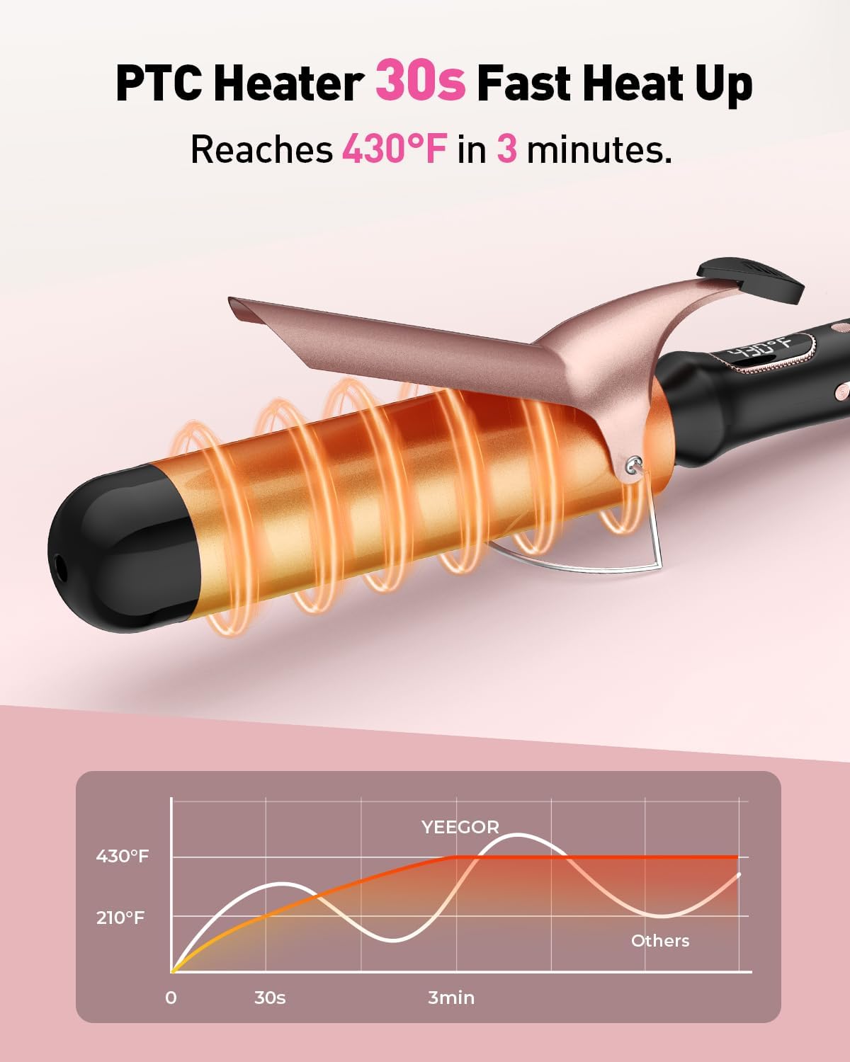 سخان بي تي سي سريع التسخين في 30 ثانية: تستخدم مكواة التجعيد ذات الأسطوانة الطويلة ييجور تقنية التسخين بي تي سي، مما يتيح لها الوصول إلى درجة حرارة تصل إلى 200 درجة فهرنهايت في غضون 60 ثانية فقط لتصفيف فوري، تصل إلى 420 درجة فهرنهايت في 3 دقائق، مما يوفر وقتك الثمين ويحمي شعرك. تحتوي مكواة التجعيد ييجور على أسطوانة أطول بنسبة 20% من مكواة التجعيد العادية، يمكنك عمل تجعيدات لطيفة وساحرة في دقائق، شريك جيد خاصة في الصباح المتسرع.