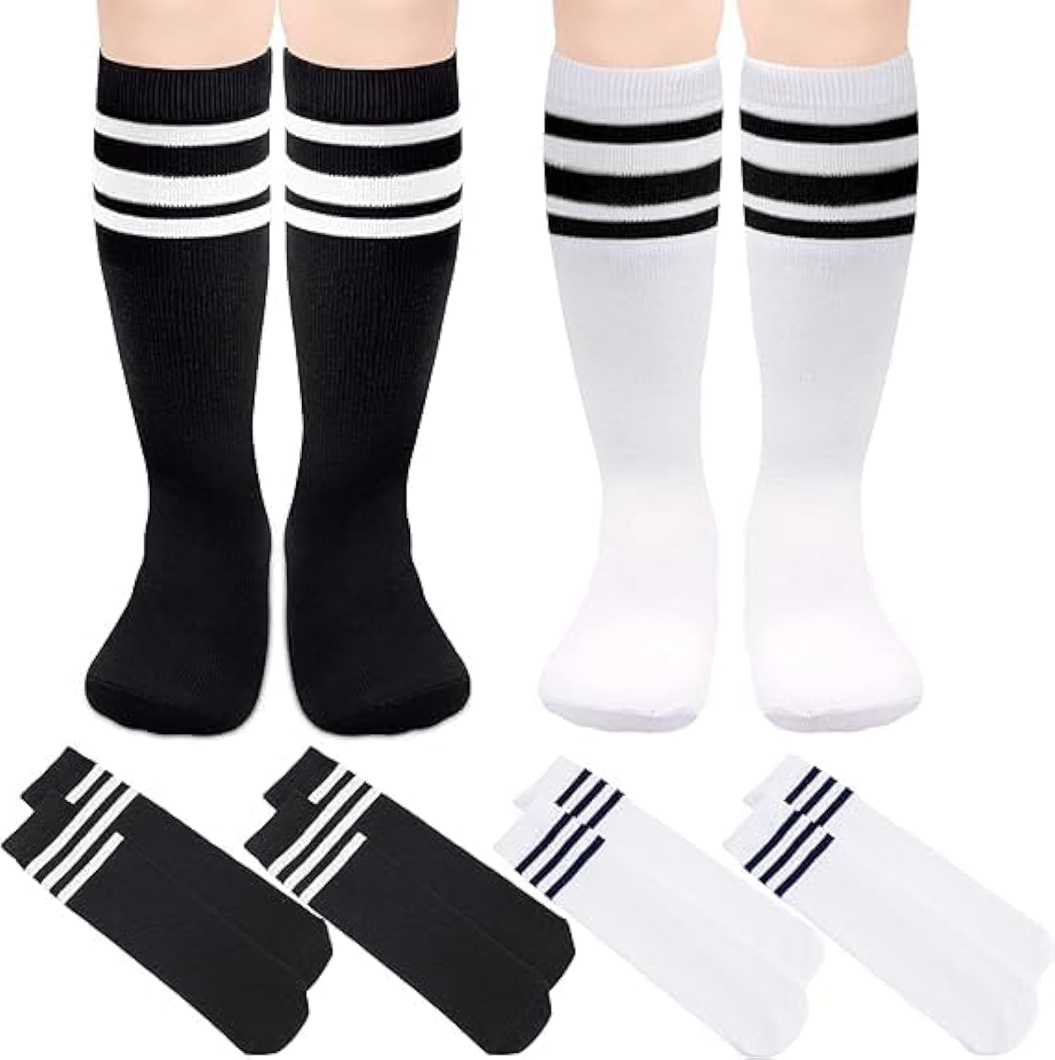 4 ازواج من جوارب كرة القدم للاطفال الصغار من تشيكابود، جوارب قطنية مخططة بطول الركبة للاولاد والبنات، جوارب طويلة مخططة للاولاد والبنات بعمر 3-6 سنوات، اسود وابيض