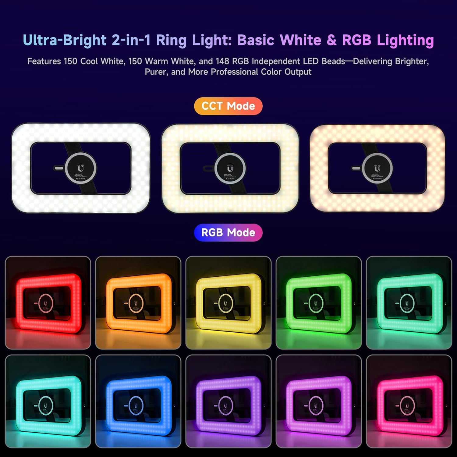 💡 ULTRA-BRIGHT ILLUMINATION: Equipped with 448 LEDs — 150 white, 150 warm, and 148 RGB — delivering both natural and creative lighting modes for selfies, makeup, vlogs, and product photography.