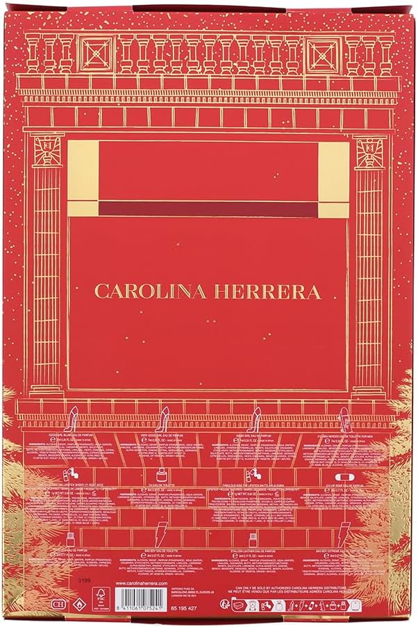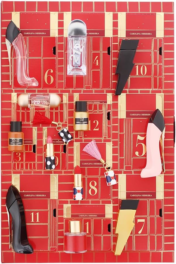 Carolina Herrera 12pcs Advent Calendar is a brilliant treat for those obsessed with fragrances from Carolina Herrera. The advent calendar contains miniature bottles of many of Carolina Herrera most notable fragrances Good Girl 7ml Eau de Parfum, Very Good Girl 7ml Eau de Parfum, Good Girl Blush 7ml Eau de Parfum, CH Women 7ml Eau de Parfum, Lipstick Sheer Rosy Date, Lipstick Matte Red Alegria ,True Oud 5ml Eau de Parfum, Stallion Leather 5ml Eau de Parfum ,Bad Boy 8ml Eau de Toilette Miniature ,Bad Boy Extreme 8ml Eau de Parfum ,212 VIP Rosé 5ml Eau de Parfum and 212 Heroes 7ml Eau de Toilette. You are certain to find a fragrance for every occasion weather that Winter, Spring or Summer. Day or night.