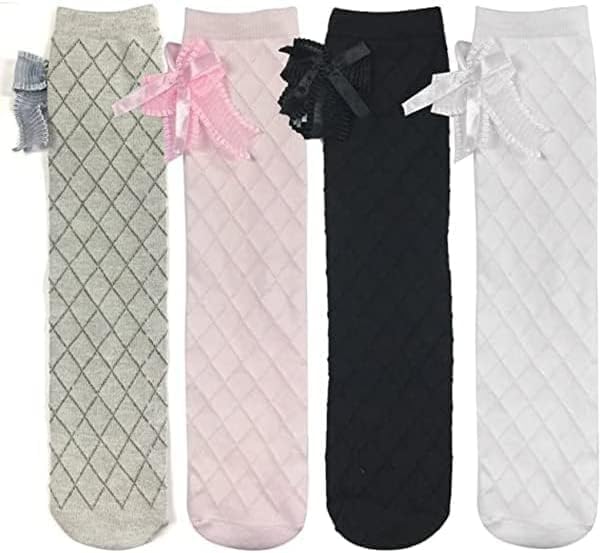 ChicAbode 4 Pairs Girls Mesh Stockings, Bow Style Knee High Socks, Girls Over The Knee Socks, Mesh Diamond Check Middle Tall Socks for Everyday, School, Home, Long