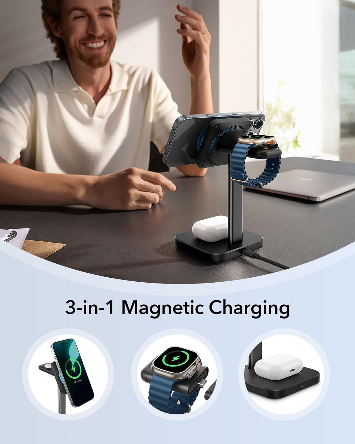 قفل مغناطيسي قوي: 1000 غرام من القوة المغناطيسية تحافظ على هاتفك في مكانه بأمان أثناء الشحن، بينما تضمن المغناطيسات المدمجة في شاحن الساعة ووسادة ايربودز المحاذاة الفورية