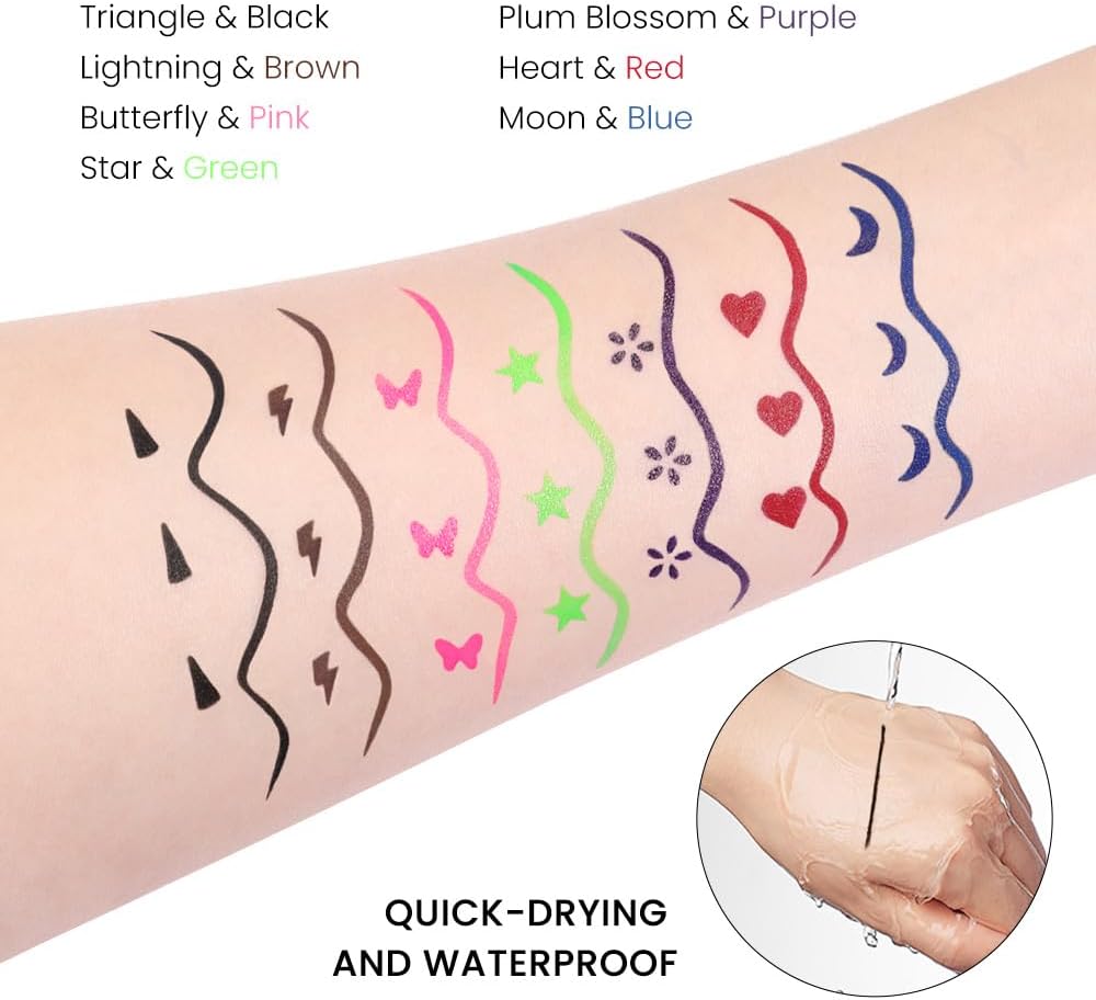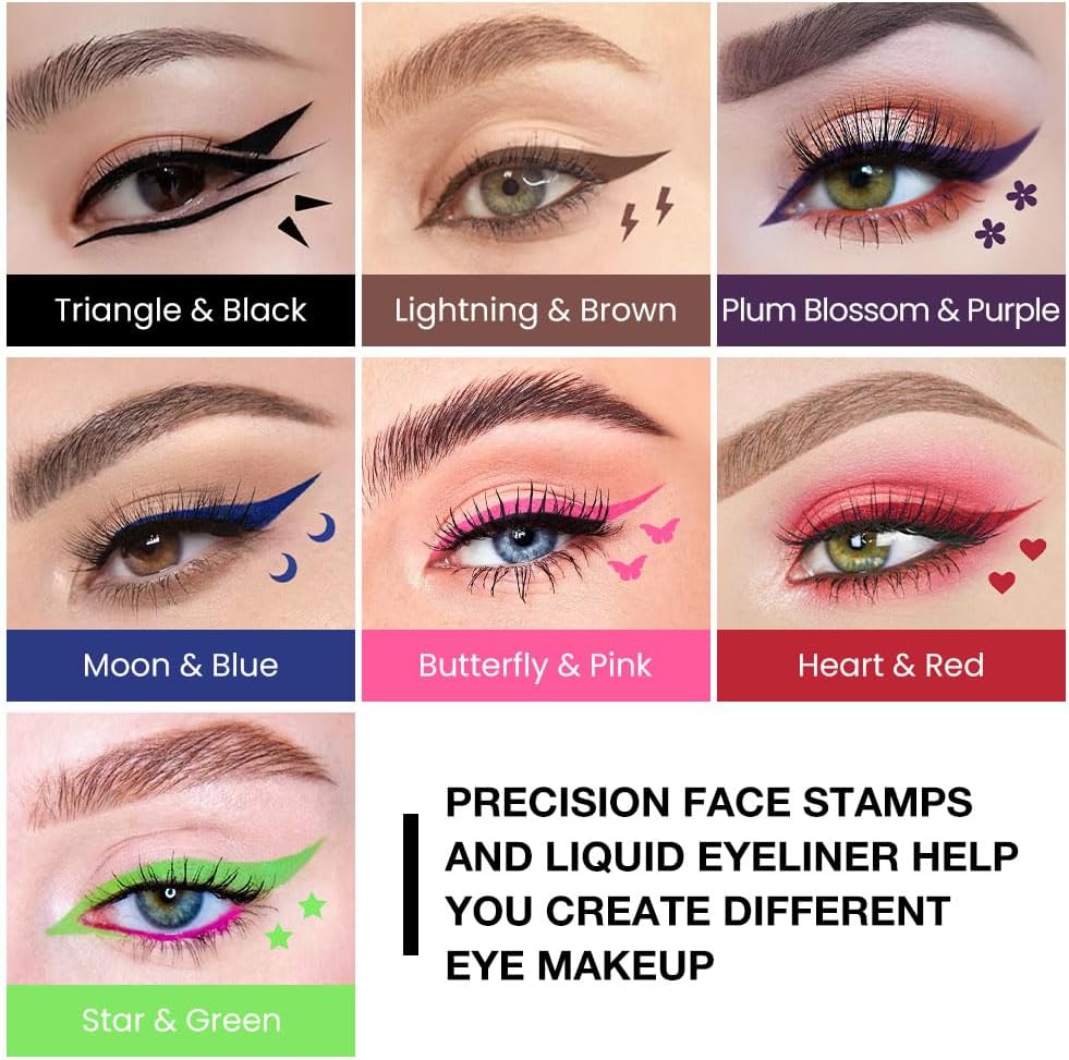 evpct 7Pcs Colored liquid Eye Liners Face Stamp Cosplay Gothic Makeup Set Kit for Beginners, Black Brown Purple Blue Red Pink Green Star Flowers Heart Moon Triangle Lightning Butterfly Stamps Eyeliner