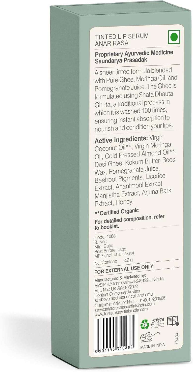 The Anar Rasa Tinted Lip Serum is a slim, sheer tinted lip moisturizer, bursting with flavour and moisture boosting serums to keep your lips moist, delicately coloured with a ruby red tint. This tinted lip conditioner is enriched with fresh Pomegranate juice, pure Cow’s Ghee and emollient healing butters that are infused in a miraculous serum to condition the delicate skin of your lips and protect them from moisture loss. Reapply the lip serum to elevate your look from functional to fabulous!