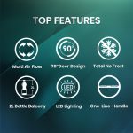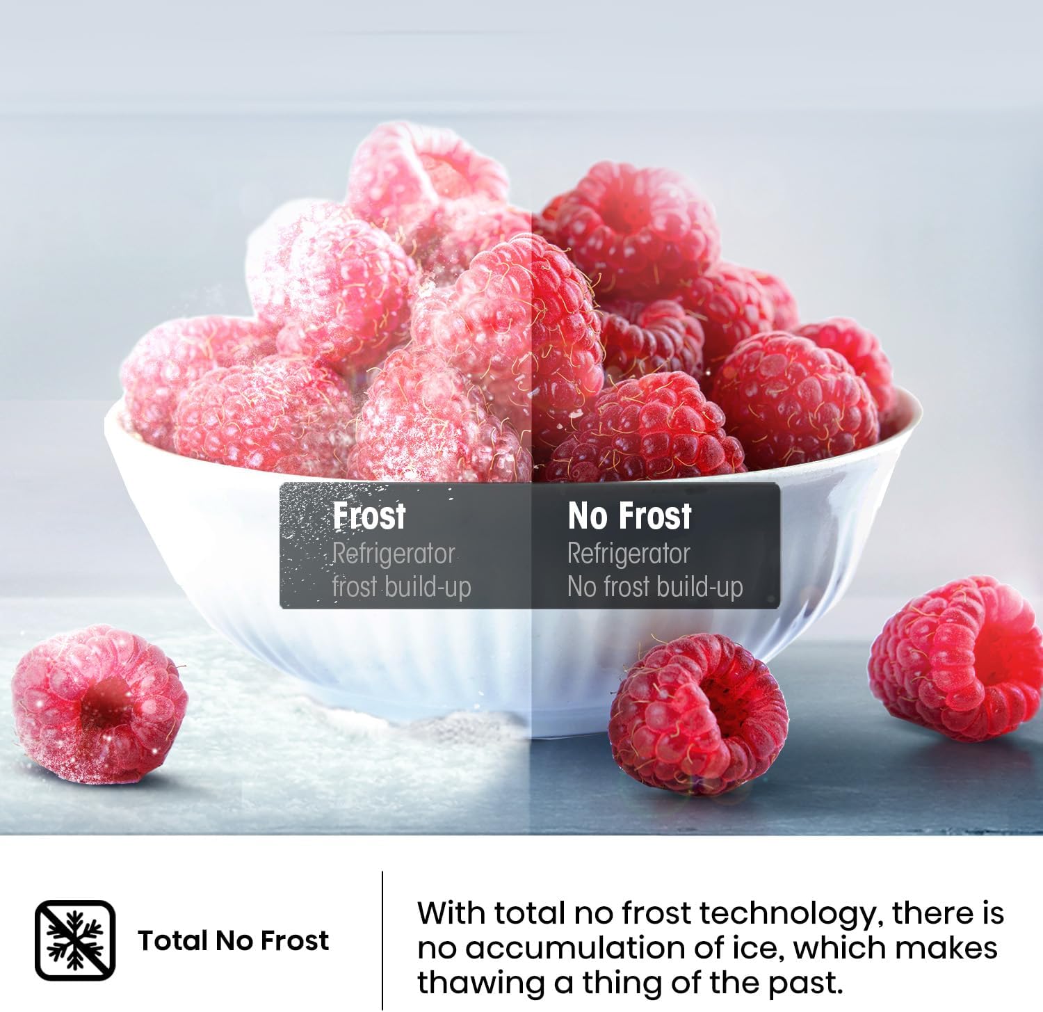 ✦ توتال نو فروست ✦ أكثر تقدمًا من تقنية توتال نو فروست المبتكرة من هايسينس تسمح للهواء البارد بالتدوير بالتساوي في جميع أنحاء الثلاجة والمجمد لمنع تشكل بلورات الثلج، لذلك لا داعي لإذابة الجليد يدويًا على الإطلاق