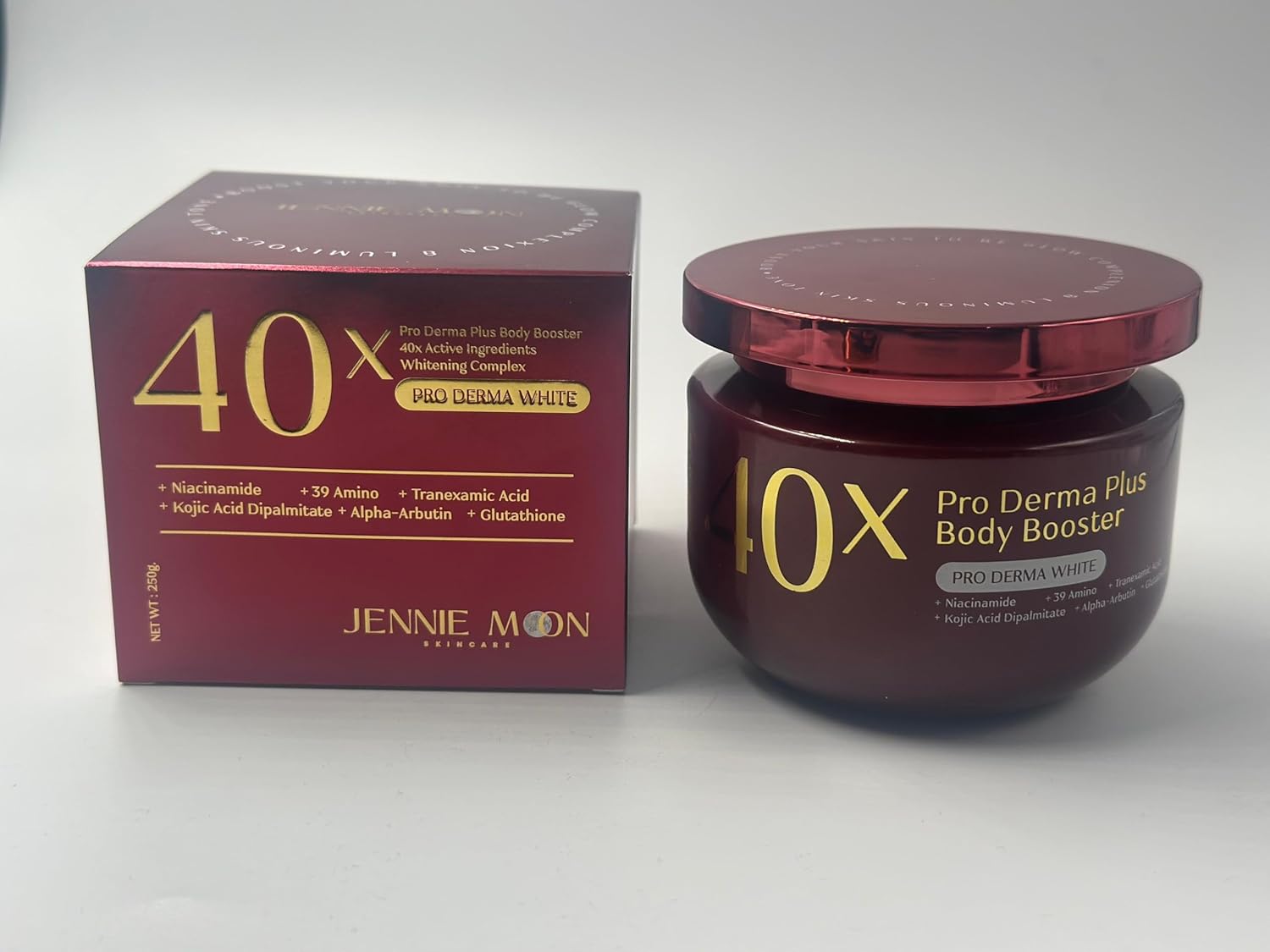 Discover the luxurious Jennie Moon Pro Derma Plus Body Booster, a premium skincare solution featuring an impressive 40x active ingredients whitening complex. This advanced formula combines powerful ingredients including Niacinamide, Kojic Acid Dipalmitate, Alpha-Arbutin, and Tranexamic Acid, along with 39 Amino acids and Glutathione. The generous 250g jar provides ample product for comprehensive body care. The rich, nourishing formula is specifically designed to boost your skin’s natural radiance while providing deep moisturisation. Perfect for those seeking a professional-grade skincare experience, this body booster helps maintain smooth, supple skin. The elegant burgundy packaging with gold accents reflects the premium quality of this sophisticated skincare product. For best results, apply regularly to nourish your body skin. This advanced formulation represents the pinnacle of modern skincare technology, bringing professional-grade treatment to your daily routine.