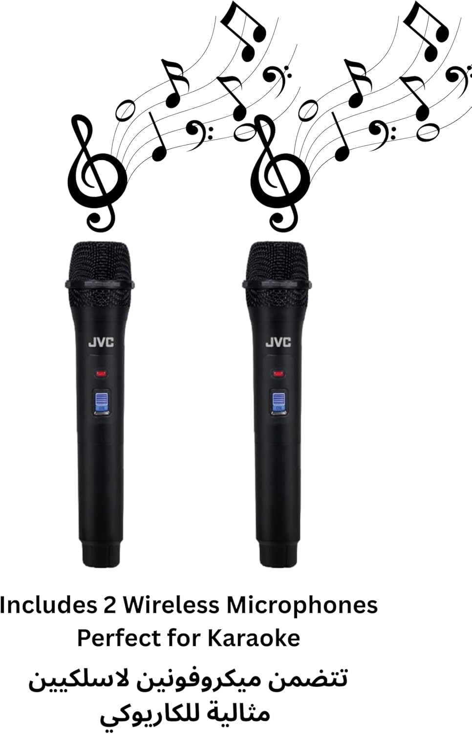 2 ميكروفون لاسلكي: استمتع بالكاريوكي أو الإعلانات السلسة مع ميكروفونين لاسلكيين متضمنين – مثالي للحفلات أو المناسبات أو المرح العائلي.