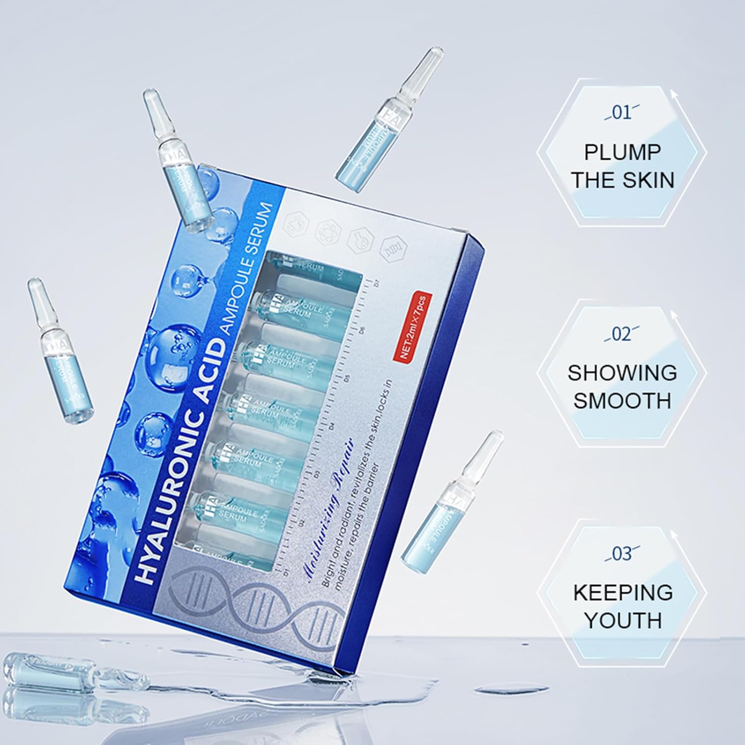 【ترطيب مكثف】: زجاجة أمبولة 7 × 2 مل من سيروم حمض الهيالورونيك المركز ترطب البشرة بعمق وتجديدها وتقلل التجاعيد وتستعيد بريقها الطبيعي ومرونتها، مما يؤدي إلى شد الوجه بشكل طبيعي وشبابي