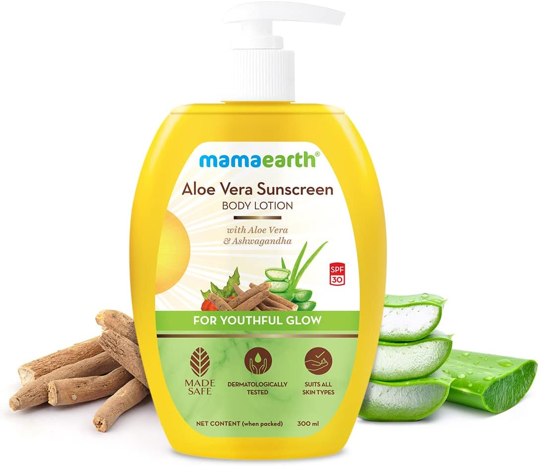 Ban the tan and pave the way for a youthful glow. Introducing Mamaearth Aloe Vera Sunscreen Body Lotion, which is enriched with the goodness of Aloe Vera and Ashwagandha. Because along with your face, your body needs sun protection too! Aloe Vera moisturizes the skin & reduces inflammation while Ashwagandha, a powerhouse of antioxidants, combats free radical damage. With a lightweight formulation, the body lotion provides non-greasy moisturization & effective sun protection with SPF 30, resulting in radiant & youthful skin. And it’s Made Safe certified, which means no toxins or harmful chemicals, only goodness of nature.