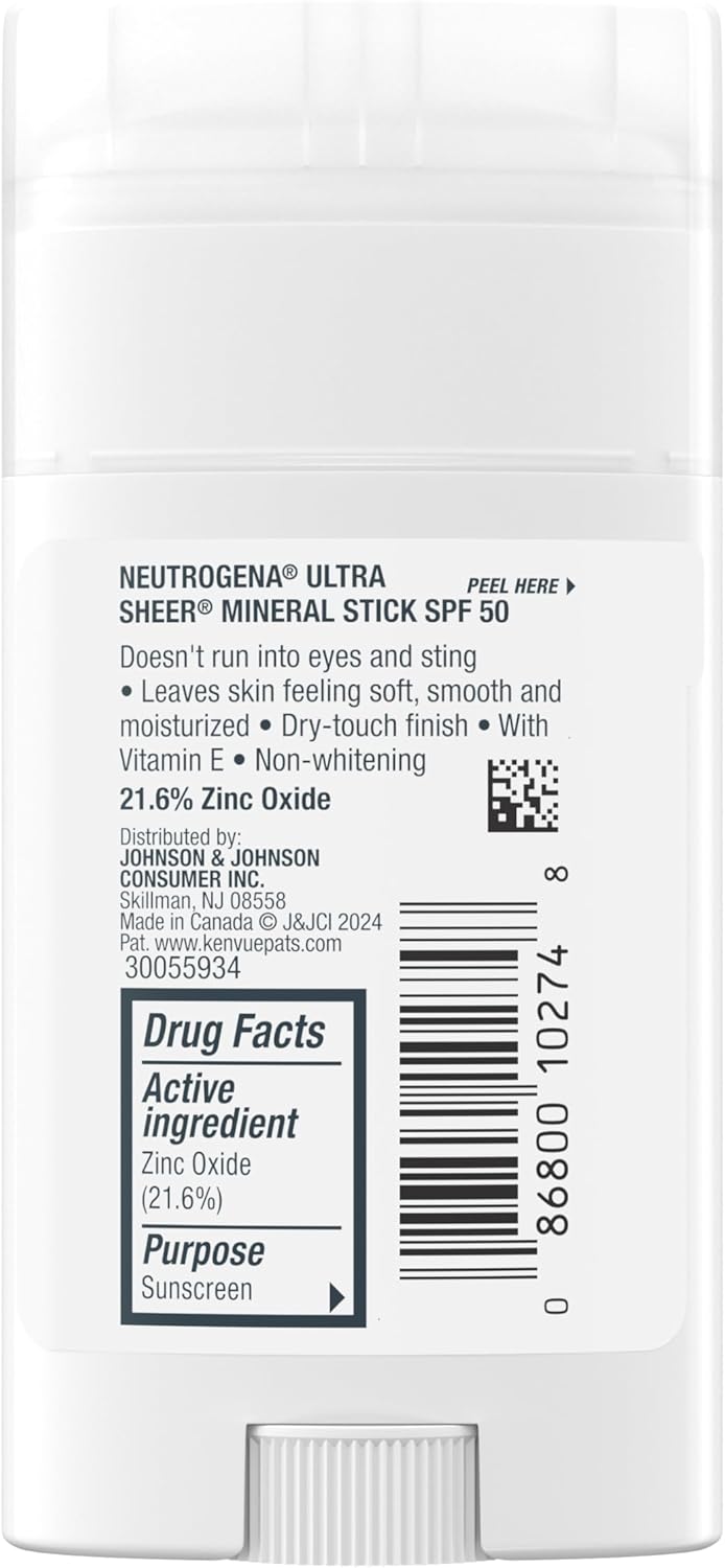 1.5-ounce Neutrogena Ultra Sheer Dry Touch SPF 50 Mineral Sunscreen Stick with zinc oxide provides broad spectrum protection against UVA and UVB rays