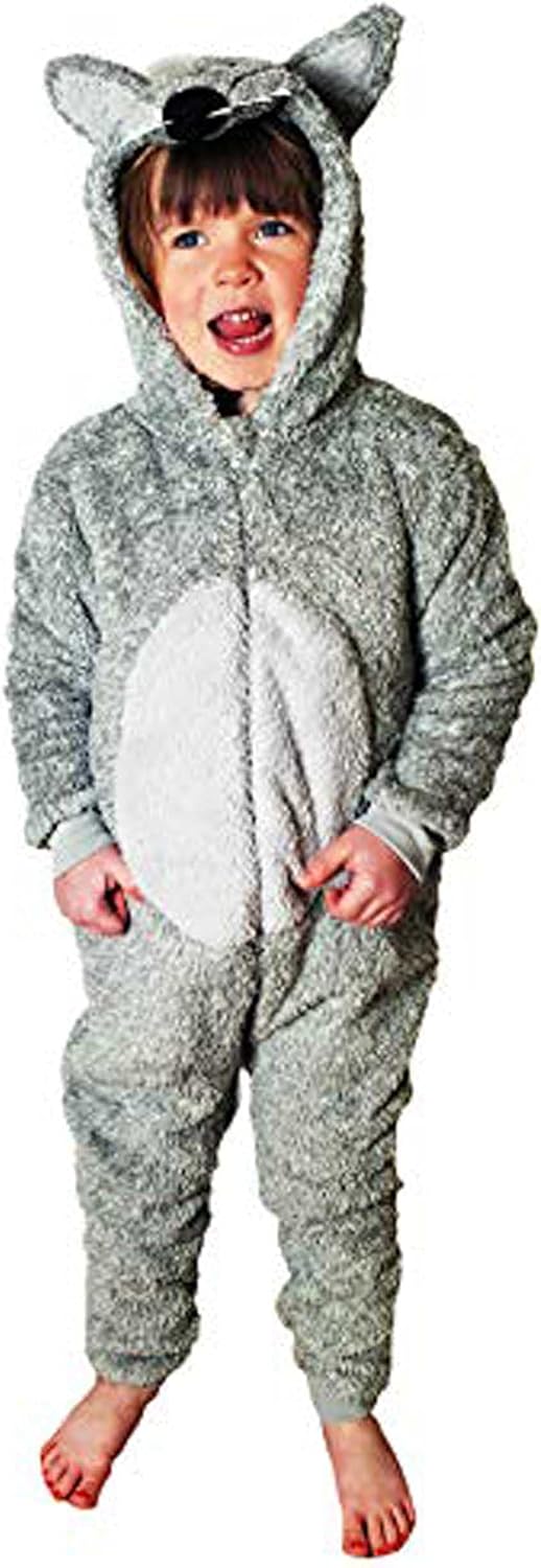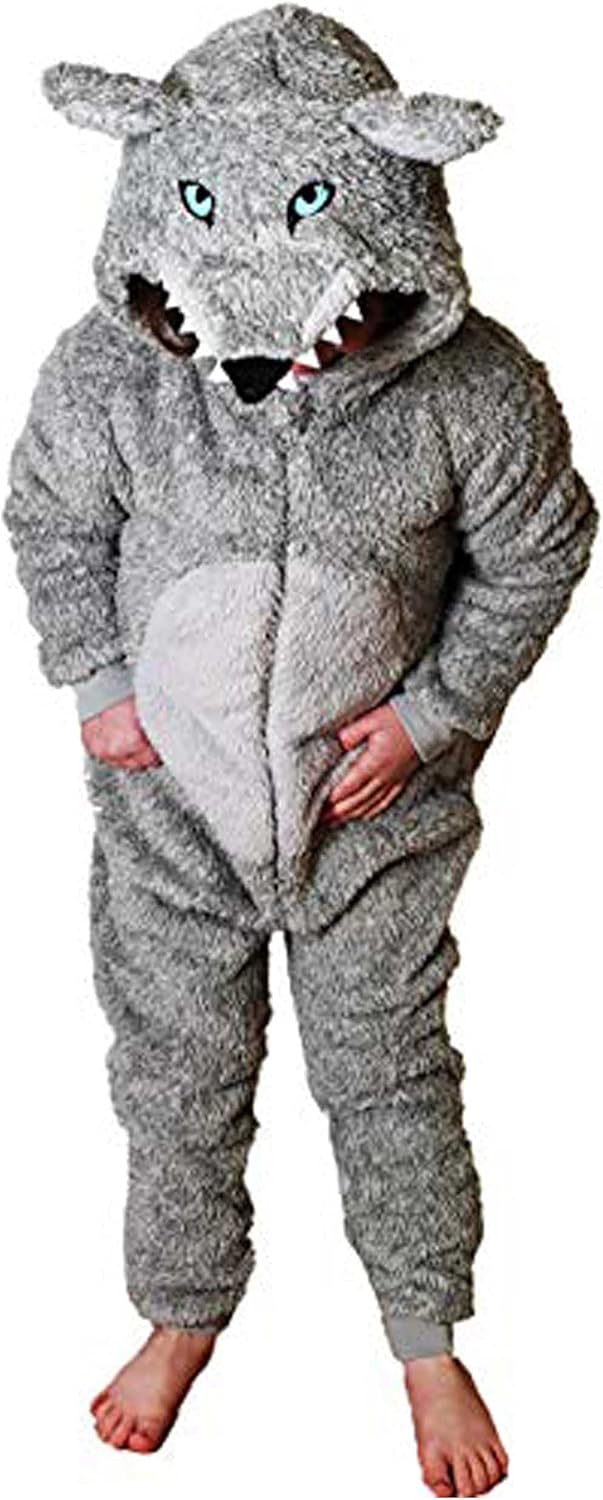 Onesie for Boys or Girls Fluffy Grey Wolf with Tail World Book Day -Animal Super Soft Fleece Costumes AllinOnes in Kids Ages 2-13 Years