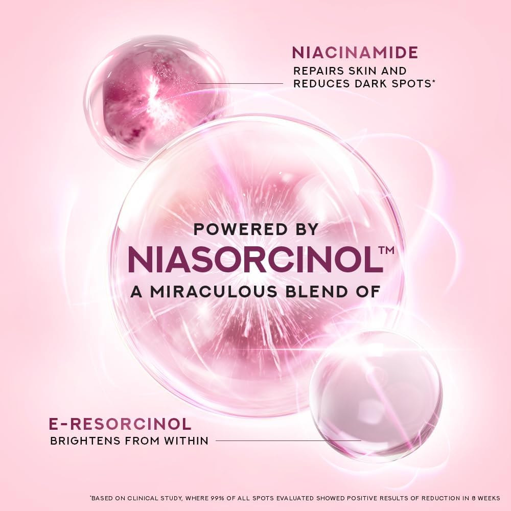At the heart of this advanced formula lies Niasorcinol, an ingredient born from 25 years of cutting-edge research at the Pond’s Skin Institute. Our patented technology harnesses the unparalleled power of Niasorcinol, delivering an unprecedented 100X more brightening power than Vitamin C, promising ultimate brightness for your complexion.